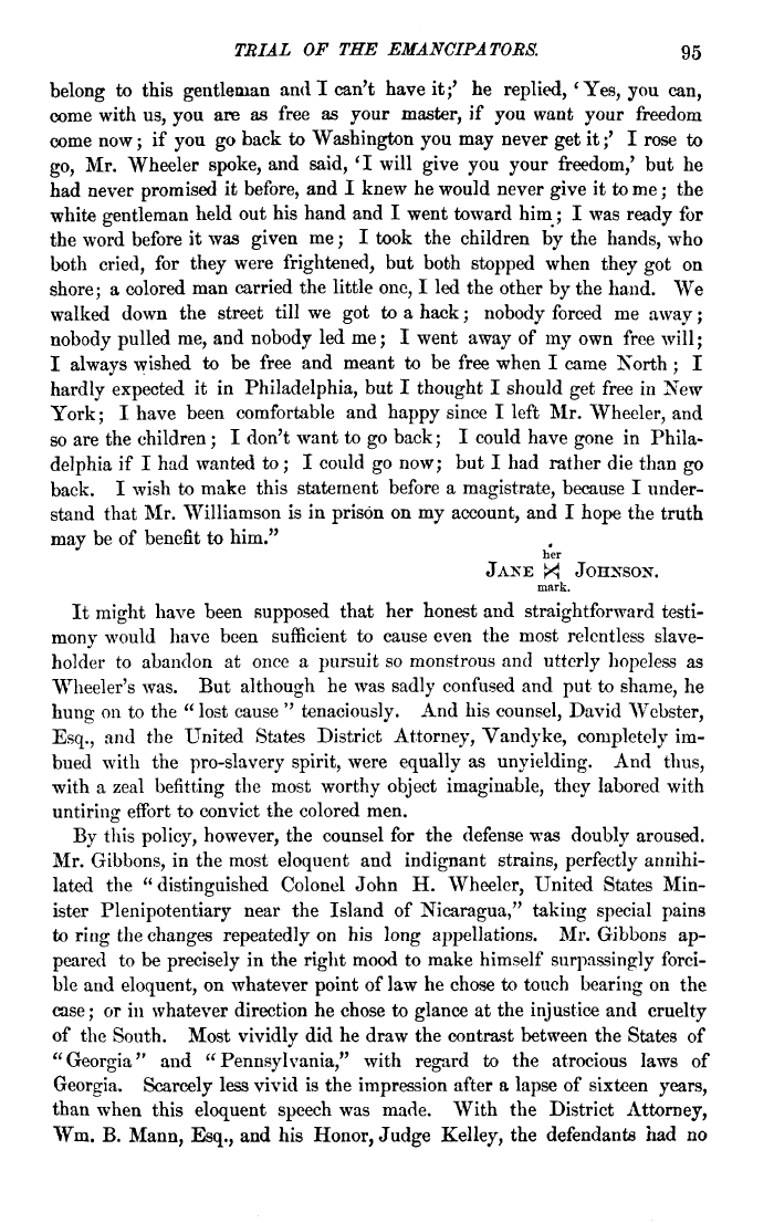 | tRial OF THE EMANCIPATORS. 95 belong to this gentleman and I can't have it;' he replied, 'Yes, you can, come with us, you are as free as your master, if you want your freedom come now; if you go back to Washington you may never get it;' I rose to go, Mr. Wheeler spoke, and said, 'I will give you your freedom,' but he had never promised it before, and I knew he would never give it to me; the white gentleman held out his hand and I went toward him; I was ready for the word before it was given me; I took the children by the hands, who both cried, for they were frightened, but both stopped when they got on shore; a colored man carried the little one, I led the other by the hand. We walked down the street till we got to a hack; nobody forced me away; nobody pulled me, and nobody led me; I went away of my own free will; I always wished to be free and meant to be free when I came Xorth ; I hardly expected it in Philadelphia, but I thought I should get free in New York; I have been comfortable and happy since I left Mr. "Wheeler, and so are the children; I don't want to go back; I could have gone in Philadelphia if I had wanted to; I could go now; but I had rather die than go back. I wish to make this statement before a magistrate, because I understand that Mr. Williamson is in prison on my account, and I hope the truth may be of benefit to him." her JAKE ft JOHNSON. mark. It might have been supposed that her honest and straightforward testimony would have been sufficient to cause even the most relentless slaveholder to abandon at once a pursuit so monstrous and utterly hopeless as "Wheeler's was. But although he was sadly confused and put to shame, he hung on to the " lost cause '' tenaciously. And his counsel, David "Webster, Esq., and the United States District Attorney, Vandyke, completely imbued with the pro-slavery spirit, were equally as unyielding. And thus, with a zeal befitting the most worthy object imaginable, they labored with untiring effort to convict the colored men. By this policy, however, the counsel for the defense was doubly aroused. Mr. Gibbons, in the most eloquent and indignant strains, perfectly annihilated the " distinguished Colonel John H. Wheeler, United States Minister Plenipotentiary near the Island of Nicaragua," taking special pains to ring the changes repeatedly on his long appellations. Mr. Gibbons appeared to be precisely in the right mood to make himself surpassingly forcible and eloquent, on whatever point of law he chose to touch bearing on the case; or in whatever direction he chose to glance at the injustice and cruelty of the South. Most vividly did he draw the contrast between the States of "Georgia" and "Pennsylvania," with regard to the atrocious laws of Georgia. Scarcely less vivid is the impression after a lapse of sixteen years, than when this eloquent speech was made. With the District Attorney, Wm. B. Mann, Esq., and his Honor, Judge Kelley, the defendants had no |