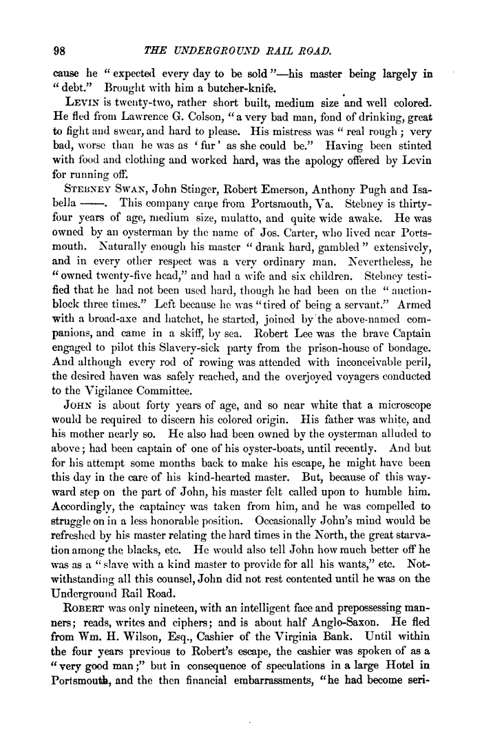 | 98 THE UNDERGROUND RAIL ROAD. cause he " expected every day to be sold "his master being largely in " debt." Brought with him a butcher-knife. LEVIN is twenty-two, rather short built, medium size and well colored. He fled from Lawrence G. Colson, " a very bad man, fond of drinking, great to fight and swear, arid hard to please. His mistress was " real rough ; very-bad, worse than he was as ' fur' as she could be." Having been stinted with food and clothing and worked hard, was the apology offered by Levin for running off. STEUNEY SWAN, John Stinger, Robert Emerson, Anthony Pugh and Isabella . This company canje from Portsmouth, Va. Stebney is thirty-four years of age, medium size, mulatto, and quite wide awake. He was owned by an oysterman by the name of Jos. Carter, who lived near Portsmouth. Naturally enough his master " drank hard, gambled " extensively, and in every other respect was a very ordinary man. Nevertheless, he " owned twenty-five head," and had a wife and six children. Stebncy testified that he had not been used hard, though he had been on the " auction-block three times." Left because he was "tired of being a servant." Armed with a broad-axe and hatchet, he started, joined by the above-named companions, and came in a skiff, by sea. Robert Lee was the brave Captain engaged to pilot this Slavery-sick party from the prison-house of bondage. And although every rod of rowing was attended with inconceivable peril, the desired haven was safely reached, and the overjoyed voyagers conducted to the Vigilance Committee. JOHN is about forty years of age, and so near white that a microscope would be required to discern his colored origin. His father was white, and his mother nearly so. He also had been owned by the oysterman alluded to above; had been captain of one of his oyster-boats, until recently. And but for his attempt some months back to make his escape, he might have been this day in the care of his kind-hearted master. But, because of this wayward step on the part of John, his master felt called upon to humble him. Accordingly, the captaincy was taken from him, and he was compelled to struggle on in a less honorable position. Occasionally John's mind would be refreshed by hi.s master relating the hard times in the North, the great starvation among the, blacks, etc. He would also tell John how much better off he was as a " slave with a kind master to provide for all his wants," etc. Notwithstanding all this counsel, John did not rest contented until he was on the Underground Rail Road. ROBERT was only nineteen, with an intelligent face and prepossessing manners; reads, writes and ciphers; and is about half Anglo-Saxon. He fled from Wm. H. Wilson, Esq., Cashier of the Virginia Bank. Until within the four years previous to Robert's escape, the cashier was spoken of as a " very good man;" but in consequence of speculations in a large Hotel in Portsmouth, and the then financial embarrassments, "he had become sen- |