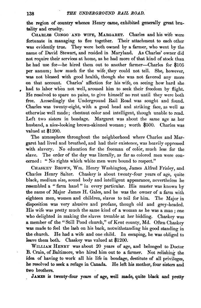 | 138 THE UNDERGROUND RAIL ROAD. the region of country whence Henry came, exhibited generally great brutality and cruelty. CHARLES CONGO AND WIFE, MARGARET. Charles and his wife were fortunate in managing to flee together. Their attachment to each other •was evidently true. They were both owned by a farmer, who went by the name of David Stewart, and resided in Maryland. As Charles' owner did not require their services at home, as he had more of that kind of stock than he had use for—he hired them out to another farmer—Charles for $105 per annum; how much for the wifetthey could not tell. She, however, was not blessed with good health, though she was not favored any more on that account. Charles' affection for his wife, on seeing how hard she had to labor when not well, aroused him to seek their freedom by flight. He resolved to spare no pains, to give himself no rest until they were both free. Accordingly the Underground Rail Road was sought and found. Charles was twenty-eight, with a good head and striking face, as well as otherwise well made; chestnut color and intelligent, though unable to read. Left two sisters in bondage. Margaret was about the same age as her husband, a nice-looking brown-skinned woman; worth $500. Charles was valued at $1200. The atmosphere throughout the neighborhood where Charles and Margaret had lived and breathed, and had their existence, was heavily oppressed with slavery. No education for the freeman of color, much less for the slave. The order of the day was literally, as far as colored men were concerned : " No rights which white men were bound to respect." CHASKEY BROWX, Wm. Henry Washington, James Alfred Frisley, and Charles Henry Salter. Chaskey is about twenty-four years of age, quite black, medium size, sound body and intelligent appearance, nevertheless he resembled a " farm hand " in every particular. His master was known by the name of Major James H. Gales, and he was the owner of a farm with eighteen men, women and children, slaves to toil for him. The Major in disposition was very abusive and profane, though old and grey-headed. His wife was pretty much the same kind of a woman as he was a man ; one who delighted in making the slaves tremble at her bidding. Chaskey was a member of the " Still Pond church," of Kent county, Md. Often Chaskey was made to feel the lash on his back, notwithstanding his good standing in the church. He had a wife and one child. In escaping, he was obliged to leave them both. Chaskey was valued at $1200. WILLIAM HBNBY was about 20 years of age, and belonged to Doctor B. Grain, of Baltimore, who hired him out to a farmer. Not relishing the idea of having to work all his life in bondage, destitute of all privileges, he resolved to seek a refuge in Canada. He left his mother, four sisters and two brothers. JAMES is twenty-four years of age, well made, quite black and pretty |