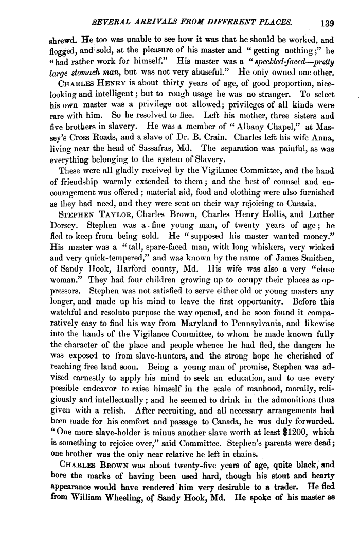 | SEVERAL ARRIVALS FROM DIFFERENT PLACES. 139 shrewd. He too was unable to see how it was that he should be worked, and flogged, and sold, at the pleasure of his master and "getting nothing;" he "had rather work for himself." His master was a "speckled-faced—pretty large stomach man, but was not very abuseful." lie only owned one other. CHARLES HENRY is about thirty years of age, of good proportion, nice-looking and intelligent; but to rough usage he was no stranger. To select his own master was a privilege not allowed; privileges of all kinds were rare with him. So he resolved to flee. Left his mother, three sisters and five brothers in slavery. He was a member of " Albany Chapel," at Mas-sey's Cross Roads, and a slave of Dr. B. Grain. Charles left his wife Anna, living near the head of Sassafras, Md. The separation was painful, as was everything belonging to the system of Slavery. These were all gladly received by the Vigilance Committee, and the hand of friendship warmly extended to them; and the best of counsel and encouragement was offered ; material aid, food and clothing were also furnished as they had need, and they were sent on their way rejoicing to Canada. STEPHEN TAYLOR, Charles Brown, Charles Henry Hollis, and Luther Dorsey. Stephen was a. fine young man, of twenty years of age; he fled to keep from being sold. He " supposed his master wanted money." His master was a " tall, spare-faced man, with long whiskers, very wicked and very quick-tempered," and was known by the name of James Smithen, of Sandy Hook, Harford county, Md. His wife was also a very "close woman." They had four children growing up to occupy their places as oppressors. Stephen was not satisfied to serve either old or young masters any longer, and made up his mind to leave the first opportunity. Before this watchful and resolute purpose the way opened, and he soon found it comparatively easy to find his way from Maryland to Pennsylvania, and likewise into the hands of the Vigilance Committee, to whom he made known fully the character of the place and people whence he had fled, the dangers he was exposed to from slave-hunters, and the strong hope he cherished of reaching free land soon. Being a young man of promise, Stephen was advised earnestly to apply his mind to seek an education, and to use every possible endeavor to raise himself in the scale of manhood, morally, religiously and intellectually; and he seemed to drink in the admonitions thus given with a relish. After recruiting, and all necessary arrangements had been made for his comfort and passage to Canada, he was duly forwarded. "One more slave-holder is minus another slave worth at least $1200, which is something to rejoice over," said Committee. Stephen's parents were dead; one brother was the only near relative he left in chains. CHARLES BROWN was about twenty-five years of age, quite black, and bore the marks of having been used hard, though his stout and hearty appearance would have rendered him very desirable to a trader. He fled from William Wheeling, of Sandy Hook, Md. He spoke of his master as |