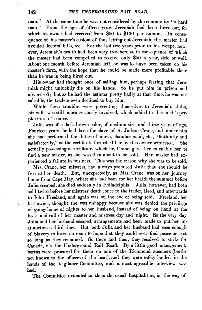 | 142 THE UNDERGROUND BAIL ROAD. man." At the same time he was not considered by the community "a hard man." From the age of fifteen years Jerenoriah had been hired out, for which his owner had received from $50 to $130 per annum. In consequence of his master's custom of thus letting out Jeremiah, the master had avoided doctors' bills, &c. For the last two years prior to his escape, however, Jeremiah's health had been very treacherous, in consequence of which the master had been compelled to receive only $50 a year, sick or well. About one month before Jeremiah left, he was to have been taken on his master's farm, with the hope that he could be made more profitable there than he was in being hired out. His owner had thought once of selling him, perhaps fearing that Jeremiah might unluckily die on his hands. So he put him in prison and advertised; but as he had the asthma pretty badly at that time, he was not saleable, the traders even declined to buy him. While these troubles were presenting themselves to Jeremiah, Julia, his wife, was still more seriously involved, which added to Jeremiah's perplexities, of course. Julia was of a dark brown color, of medium size, and thirty years of age. Fourteen years she had been the slave of A. Judson Crane, and under him she had performed the duties of nurse, chamber-maid, etc., "faithfully and satisfactorily," as the certificate furnished her by this owner witnessed. She actually possessing a certificate, which he, Crane, gave her to enable her to find a new master, as she was then about to be sold. Her master had experienced a failure in business. This was the reason why she was to be sold. Mrs. Crane, her mistress, had always promised Julia that she should be free at her death. Bat, unexpectedly, as Mrs. Crane was on her journey home from Cape May, where she had been for her health the summer before Julia escaped, she died suddenly in Philadelphia. Julia, however, had been sold twice before her mistress' death; once to the trader, Reed, and afterwards to John Freeland, and again was on the eve of being sold. Freeland, her last owner, thought she was unhappy because she was denied the privilege of going home of nights to her husband, instead of being on hand at the beck and call of her master and mistress day and night. So the very day Julia and her husband escaped, arrangements had been made to put her up at auction a third time. But both Julia and her husband had seen enough of Slavery to leave no room to hope that they could ever find peace or rest so long as they remained. So there'and then, they resolved to strike for Canada, via the Underground Rail Road. By a little good management, berths were procured for them on one of the Richmond steamers (berths not known to the officers of the boat), and they were safely labded in the hands of the Vigilance Committee, and a most agreeable interview was had. The Committee extended to them the usual hospitalities, in the way of |
