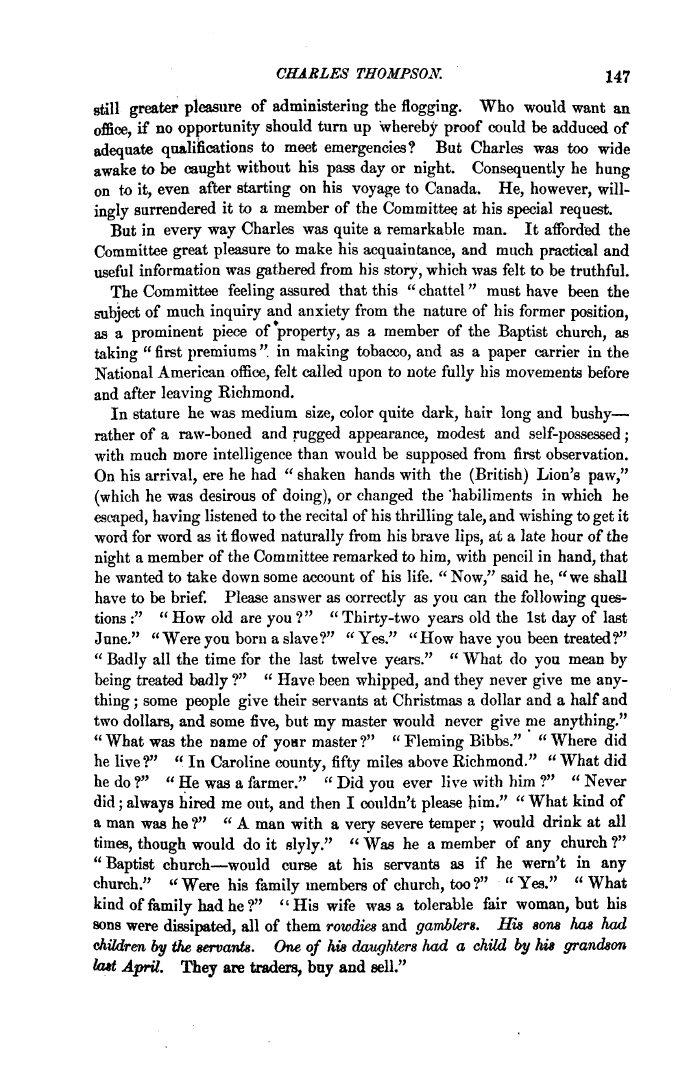 | CHARLES THOMPSON. 147 still greater pleasure of administering the flogging. Who would want an office, if no opportunity should turn up whereby proof could be adduced of adequate qualifications to meet emergencies? But Charles was too wide awake to be caught without his pass day or night. Consequently he hung on to it, even after starting on his voyage to Canada. He, however, willingly surrendered it to a member of the Committee at his special request. But in every way Charles was quite a remarkable man. It afforded the Committee great pleasure to make his acquaintance, and much practical and useful information was gathered from his story, which was felt to be truthful. The Committee feeling assured that this " chattel" must have been the subject of much inquiry and anxiety from the nature of his former position, as a prominent piece of property, as a member of the Baptist church, as taking "first premiums", in making tobacco, and as a paper carrier in the National American office, felt called upon to note fully his movements before and after leaving Richmond. In stature he was medium size, color quite dark, hair long and bushy— rather of a raw-boned and rugged appearance, modest and self-possessed; with much more intelligence than would be supposed from first observation. On his arrival, ere he had " shaken hands with the (British) Lion's paw," (which he was desirous of doing), or changed the 'habiliments in which he escaped, having listened to the recital of his thrilling tale, and wishing to get it word for word as it flowed naturally from his brave lips, at a late hour of the night a member of the Committee remarked to him, with pencil in hand, that he wanted to take down some account of his life. " Now," said he, " we shall have to be brief. Please answer as correctly as you can the following questions :" " How old are you ?" " Thirty-two years old the 1st day of last June." "Were you born a slave?" " Yes." "How have you been treated?" " Badly all the time for the last twelve years." " What do you mean by being treated badly ?" " Have been whipped, and they never give me anything ; some people give their servants at Christmas a dollar and a half and two dollars, and some five, but my master would never give rue anything." " What was the name of your master ?" " Fleming Bibbs." " Where did he live?" " In Caroline county, fifty miles above Richmond." " What did he do ?" " He was a farmer." " Did you ever live with him ?" " Never did; always hired me out, and then I couldn't please him." " What kind of a man was he ?" " A man with a very severe temper ; would drink at all times, though would do it slyly." " Was he a member of any church ?" "Baptist church—would curse at his servants as if he wern't in any church." "Were his family members of church, too?" " Yes." " What kind of family had he?" "His wife was a tolerable fair woman, but his sons were dissipated, all of them rowdies and gamblers. ŁKs sons has had children by the servants. One of his daughters had a child by his grandson fatt April. They are traders, bay and sell." |
