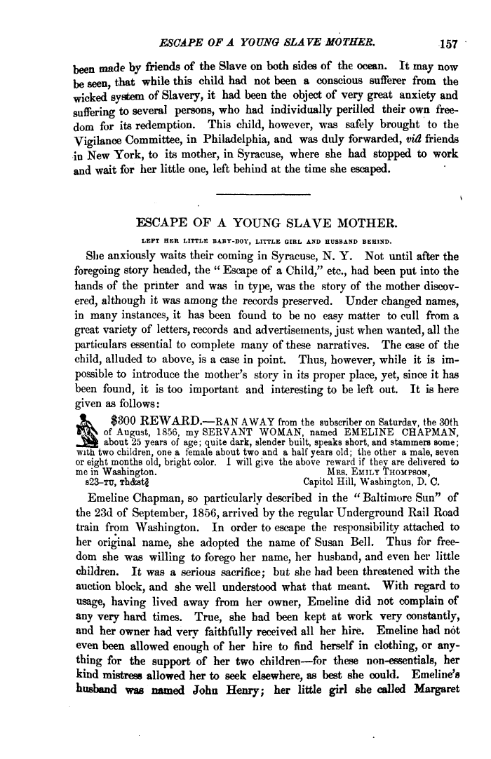 | ESCAPE OF A YO UNO SLA VE MOTHER. \ 57 been made by friends of the Slave on both sides of the ocean. It may now be seen, that while this child had not been a conscious sufferer from the wicked system of Slavery, it had been the object of very great anxiety and suffering to several persons, who had individually perilled their own freedom for its redemption. This child, however, was safely brought to the Vigilan06 Committee, in Philadelphia, and was duly forwarded, vid friends in New York, to its mother, in Syracuse, where she had stopped to work and wait for her little one, left behind at the time she escaped. ESCAPE OF A YOUNG SLAVE MOTHER. LEFT HER LITTLE BABY-BOY, LITTLE GIRL AND HUSBAND BEHIND. She anxiously waits their coming in Syracuse, N. Y. Not until after the foregoing story headed, the " Escape of a Child," etc., had been put into the hands of the printer and was in type, was the story of the mother discovered, although it was among the records preserved. Under changed names, in many instances, it has been found to be no easy matter to cull from a great variety of letters, records and advertisements, just when wanted, all the particulars essential to complete many of these narratives. The case of the child, alluded to above, is a case in point. Thus, however, while it is impossible to introduce the mother's story in its proper place, yet, since it has been found, it is too important and interesting to be left out. It is here given as follows: $300 REWARD.—RAN AWAY from the subscriber on Saturday, the 30th of Augu3t, 1856, my SERVANT WOMAN, named EMELINE CHAPMAN, about 25 years of age; quite dark, slender built, speaks short, and stammers some; with two children, one a female about two and a half years old; the other a male, seven or eight months old, bright color. I will give the above reward if they are delivered to me in Washington. MRS. EMILY THOMPSON, 823-TTJ, Th&stg Capitol Hill, Washington, D. C. Emeline Chapman, so particularly described in the " Baltimore Sun" of the 23d of September, 1856, arrived by the regular Underground Rail Road train from Washington. In order to escape the responsibility attached to her original name, she adopted the name of Susan Bell. Thus for freedom she was willing to forego her name, her husband, and even her little children. It was a serious sacrifice; but she had been threatened with the auction block, and she well understood what that meant. With regard to usage, having lived away from her owner, Emeline did not complain of any very hard times. True, she had been kept at work very constantly, and her owner had very faithfully received all her hire. Emeline had not even been allowed enough of her hire to find herself in clothing, or anything for the support of her two children—for these non-essentials, her kind mistress allowed her to seek elsewhere, as best she could. Emeline'a husband was named John Henry; her little girl she called Margaret |
