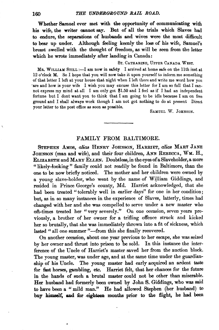 | 160 THE UNDERGROUND RAIL ROAD. Whether Samuel ever met with the opportunity of communicating with his wife, the writer cannot say. Bat of all the trials which Slaves had to endure, the separations of husbands and wives were the most difficult to bear up under. Although feeling keenly the loss of his wife, Samuel's breast swelled with the thought of freedom, as will be seen from the letter which he wrote immediately after landing in Canada: ST. CATHARINE, UPPER CANADA WEST. ME. WILLIAM STILL :—I am now in safety I arrived at home safe on the llth inst at 12 o'clock M. So I hope that you will now take it upon yourself to inform me something of that letter I left at your house that night when I left there and write me word how you 'are and how is your wife I wish you may excuse this letter for I am so full that I cannot express my mind at all I am only got $1.50 and I feel as if I had an independent fortune but I dont want you to think that I am going to be idle because I am on free ground and I shall always work though I am not got nothing to do at present Direct your letter to the post office as soon as possible. SAMUEL W. JOHNSON. FAMILY FROM BALTIMORE. STEPHEN AMOS, ottos HENRY JOHNSON, HARRIET, alias MARY JANE JOHNSON (man and wife), and their four children, ANN REBECCA, WM. H., ELIZABETH and MARY ELLEN. Doubtless, in the eyes of a Slaveholder, a more " likely-looking " family could not readily be found in Baltimore, than the one to be now briefly noticed. The mother and her children were owned by a young slave-holder, vrho went by the name of William Giddings, and resided in Prince George's county, Md. Harriet acknowledged, that she had been treated "tolerably well in earlier days" for one in her condition; but, as in so many instances in the experience of Slaves, latterly, times had changed with her and she was compelled to serve under a new master who oft-times treated her " very severely." On one occasion, seven years previously, a brother of her owner for a trifling offence struck and kicked her so brutally, that she was immediately thrown into a fit of sickness, which lasted " all one summer "—from this she finally recovered. On another occasion, about one year previous to her escape, she was seized by her owner and thrust into prison to Tbe sold. In this instance the interference of the Uncle of Harriet's master saved her from the auction block. The young master, was under age, and at the same time under the guardianship of his Uncle. The young master had early acquired an ardent taste for fast horses, gambling, etc. Harriet felt, that her chances for the future in the hands of such a brutal master could not be other than miserable. Her husband had formerly been owned by John S. Giddings, who was said to have been a " mild man." He had allowed Stephen (her husband) to buy himself, and for eighteen months prior to the flight, he had been |
