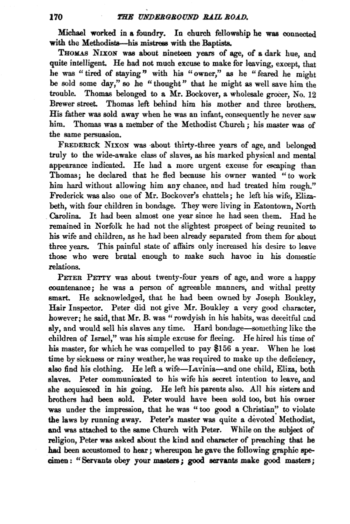 | 170 TSE UNDERGROUND RAILROAD. Michael worked in a foundry. la church fellowship he was connected with the Methodists—his mistress with the Baptists. THOMAS NIXON was about nineteen years of age, of a dark hue, and quite intelligent. He had not much excuse to make for leaving, except, that he was "tired of staying" with his "owner," as he "feared he might be sold some day," so he " thought" that he might as well save him the trouble. Thomas belonged to a Mr. Bockover, a wholesale grocer, No. 12 Brewer street Thomas left behind him his mother and three brothers. His father was sold away when he was an infant, consequently he never saw him. Thomas was a member of the Methodist Church ; his master was of the same persuasion. FREDERICK NIXON was about thirty-three years of age, and belonged truly to the wide-awake class of slaves, as his marked physical and mental appearance indicated. He had a more urgent excuse for escaping than Thomas j he declared that he fled because his owner wanted "to work him hard without allowing him any chance, and had treated him rough." Frederick was also one of Mr. Bockover's chattels; he left his wife, Elizabeth, with four children in bondage. They were living in Eatontown, North Carolina. It had been almost one year since he had seen them. Had he remained in Norfolk he had not the slightest prospect of being reunited to his wife and children, as he had been already separated from them for about three years. This painful state of affairs only increased his desire to leave those who were brutal enough to make such havoc in his domestic relations. PETER PETTY was about twenty-four years of age, and wore a happy countenance; he was a person of agreeable manners, and withal pretty smart. He acknowledged, that he had been owned by Joseph Boukley, Hair Inspector. Peter did not give Mr. Boukley a very good character, however; he said, that Mr. B. was "rowdyish in his habits, was deceitful and sly, and would sell his slaves any time. Hard bondage—something like the children of Israel," was his simple excuse for fleeing. He hired his time of his master, for which he was compelled to pay $156 a year. When he lost time by sickness or rainy weather, he was required to make up the deficiency, also find his clothing. He left a wife—Lavinia—and one child, Eliza, both slaves. Peter communicated to his wife his secret intention to leave, and she acquiesced in his going. He left his parents also. All his sisters and brothers had been sold. Peter would have been sold too, but his owner was under the impression, that he was " too good a Christian" to violate the laws by running away. Peter's master was quite a devoted Methodist, and was attached to the same Church with Peter. While on the subject of religion, Peter was asked about the kind and character of preaching that he had been accustomed to hear; whereupon he gave the following graphic specimen: "Servants obey jour masters; good servants make good masters; |