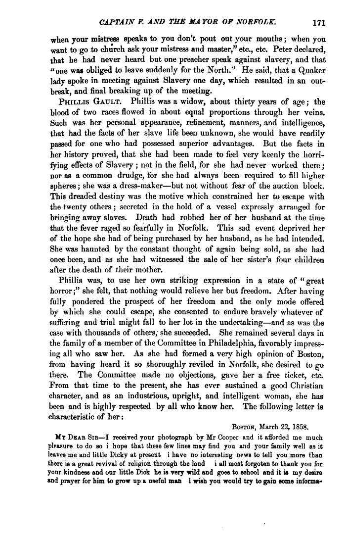 | CAPTAIN F. AND THE MA YOB OF NORFOLK. 171 when your mistress speaks to you don't pout out your mouths; when you want to go to church ask your mistress and master," etc., etc. Peter declared, that he had never heard but one preacher speak against slavery, and that "one was obliged to leave suddenly for the North.'* He said, that a Quaker lady spoke in meeting against Slavery one day, which resulted in an outbreak, and final breaking up of the meeting. PHILLIS GAULT. Phillis was a widow, about thirty years of age; the blood of two races flowed in about equal proportions through her veins. Such was her personal appearance, refinement, manners, and intelligence, that had the facts of her slave life been unknown, she would have readily passed for one who had possessed superior advantages. But the facts in her history proved, that she had been made to feel very keenly the horrifying effects of Slavery ; not in the field, for she had never worked there; nor as a common drudge, for she had always been required to fill higher spheres; she was a dress-maker—but not without fear of the auction block. This dreaded destiny was the motive which constrained her to escape with the twenty others; secreted in the hold of a vessel expressly arranged for bringing away slaves. Death had robbed her of her husband at the time that the fever raged so fearfully in Norfolk. This sad event deprived her of the hope she had of being purchased by her husband, as lie had intended. She was haunted by the constant thought of again being sold, as she had once been, and as she had witnessed the sale of her sister's four children after the death of their mother. Phillis was, to use her own striking expression in a state of "great horror;" she felt, that nothing would relieve her but freedom. After having fully pondered the prospect of her freedom and the only mode offered by which she could escape, she consented to endure bravely whatever of suffering and trial might fall to her lot in the undertaking—and as was the case with thousands of others, she succeeded. She remained several days in the family of a member of the Committee in Philadelphia, favorably impressing all who saw her. As she had formed a very high opinion of Boston, from having heard it so thoroughly reviled in Norfolk, she desired to go there. The Committee made no objections, gave her a free ticket, etc. From that time to the present, she has ever sustained a good Christian character, and as an industrious, upright, and intelligent woman, she has been and is highly respected by all who know her. The following letter is characteristic of her: BOSTON, March 22, 1858. MY DEAR SIB—I received your photograph by Mr Cooper and it afforded me much pleasure to do so i hope that these few lines may find you and your family well as it leaves me and little Dicky at present i have no interesting news to tell you more than there is a great revival of religion through the land i all most forgoten to thank you for your kindness and our little Dick he is very wild and goes to school and it is my desire and prayer for him to grow np a useful man i wish you would try to gain some informa- |