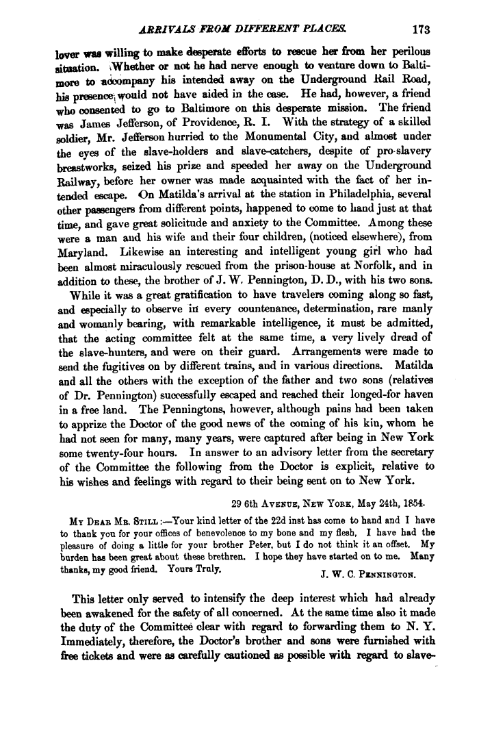| ARRIVALS FROM DIFFERENT PLACES. 173 lover was willing to make desperate efforts to rescue her from her perilous situation. -Whether or not he had nerve enough to venture down to Baltimore to accompany his intended away on the Underground Kail Road, his presence, \pould not have aided in the case. He had, however, a friend who consented to go to Baltimore on this desperate mission. The friend •was James Jefferson, of Providence, R. I. With the strategy of a skilled soldier, Mr. Jefferson hurried to the Monumental City, and almost under the eyea of the slave-holders and slave-catchers, despite of pro slavery breastworks, seized his prize and speeded her away on the Underground Railway, before her owner was made acquainted with the feet of her intended escape. On Matilda's arrival at the station in Philadelphia, several other passengers from different points, happened to come to Land just at that time, and gave great solicitude and anxiety to the Committee. Among these were a man aud his wife and their four children, (noticed elsewhere), from Maryland. Likewise an interesting and intelligent young girl who had been almost miraculously rescued from the prison-house at Norfolk, and in addition to these, the brother of J. W- Pennington, D. D., with his two sons. While it was a great gratification to have travelers coming along so fast, and especially to observe in every countenance, determination, rare manly and womanly bearing, with remarkable intelligence, it must be admitted, that the acting committee felt at the same time, a very lively dread of the slave-hunters, and were on their guard. Arrangements were made to send the fugitives on by different trains, and in various directions. Matilda and all the others with the exception of the father and two sons (relatives of Dr. Pennington) successfully escaped and reached their longed-for haven in a free land. The Penningtons, however, although pains had been taken to apprize the Doctor of the good news of the coming of his kin, whom he had not seen for many, many years, were captured after being in New York some twenty-four hours. In answer to an advisory letter from the secretary of the Committee the following from the Doctor is explicit, relative to his wishes and feelings with regard to their being sent on to New York. 29 6th AVENUE, NEW YOBK, May 24th, 1854. MY DEAR ME. STILL :—Your kind letter of the 22d inst has come to hand and I have to thank you for your offices of benevolence to my bone and my flesh, I have had the pleasure of doing a little for your brother Peter, but I do not think it an offset. My burden has been great about these brethren. I hope they have started on to me. Many thanks, my good friend. Yours Truly. ^ w Q p^,^ This letter only served to intensify the deep interest which had already been awakened for the safety of all concerned. At the same time also it made the duty of the Committee clear with regard to forwarding them to N. Y. Immediately, therefore, the Doctor's brother and sons were furnished with free tickets and were as carefully cautioned as possible with regard to slave- |