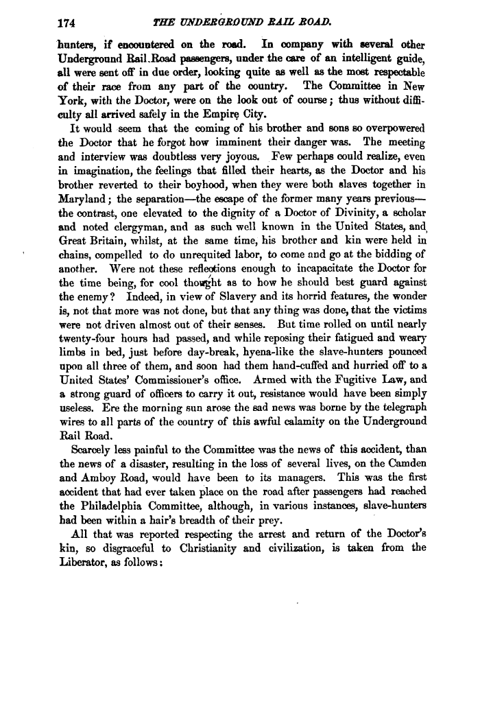 | 174 THE UNDERGROUND RAIL ROAD. banters, if encountered on the road. In company with several other Underground Bail.Road passengers, under the care of an intelligent guide, all were sent off in doe order, looking quite as well as the most respectable of their race from any part of the country. The Committee in New York, with the Doctor, were on the look oat of course; thus without difficulty all arrived safely in the Empire City. It would seem that the coming of his brother and sons so overpowered the Doctor that he forgot how imminent their danger was. The meeting and interview was doubtless very joyous. Few perhaps could realize, even in imagination, the feelings that filled their hearts, as the Doctor and his brother reverted to their boyhood, when they were both slaves together in Maryland; the separation—the escape of the former many years previous— the contrast, one elevated to the dignity of a Doctor of Divinity, a scholar and noted clergyman, and as such well known in the United States, and Great Britain, whilst, at the same time, his brother and kin were held in chains, compelled to do unrequited labor, to come and go at the bidding of another. Were not these reflections enough to incapacitate the Doctor for the time being, for cool thowght as to how he should best guard against the enemy ? Indeed, in view of Slavery and its horrid features, the wonder is, not that more was not done, but that any thing was done, that the victims were not driven almost out of their senses. But time rolled on until nearly twenty-four hours had passed, and while reposing their fatigued and weary limbs in bed, just before day-break, hyena-like the slave-hunters pounced upon all three of them, and soon had them hand-cuffed and hurried off to a United States' Commissioner's office. Armed with the Fugitive Law, and a strong guard of officers to carry it out, resistance would have been simply useless. Ere the morning sun arose the sad news was borne by the telegraph wires to all parts of the country of this awful calamity on the Underground Rail Road. Scarcely less painful to the Committee was the news of this accident, than the news of a disaster, resulting in the loss of several lives, on the Camden and Amboy Road, would have been to its managers. This was the first accident that had ever taken place on the road after passengers had reached the Philadelphia Committee, although, in various instances, slave-hunters had been within a hair's breadth of their prey. All that was reported respecting the arrest and return of the Doctor's kin, so disgraceful to Christianity and civilization, is taken from the Liberator, as follows: |