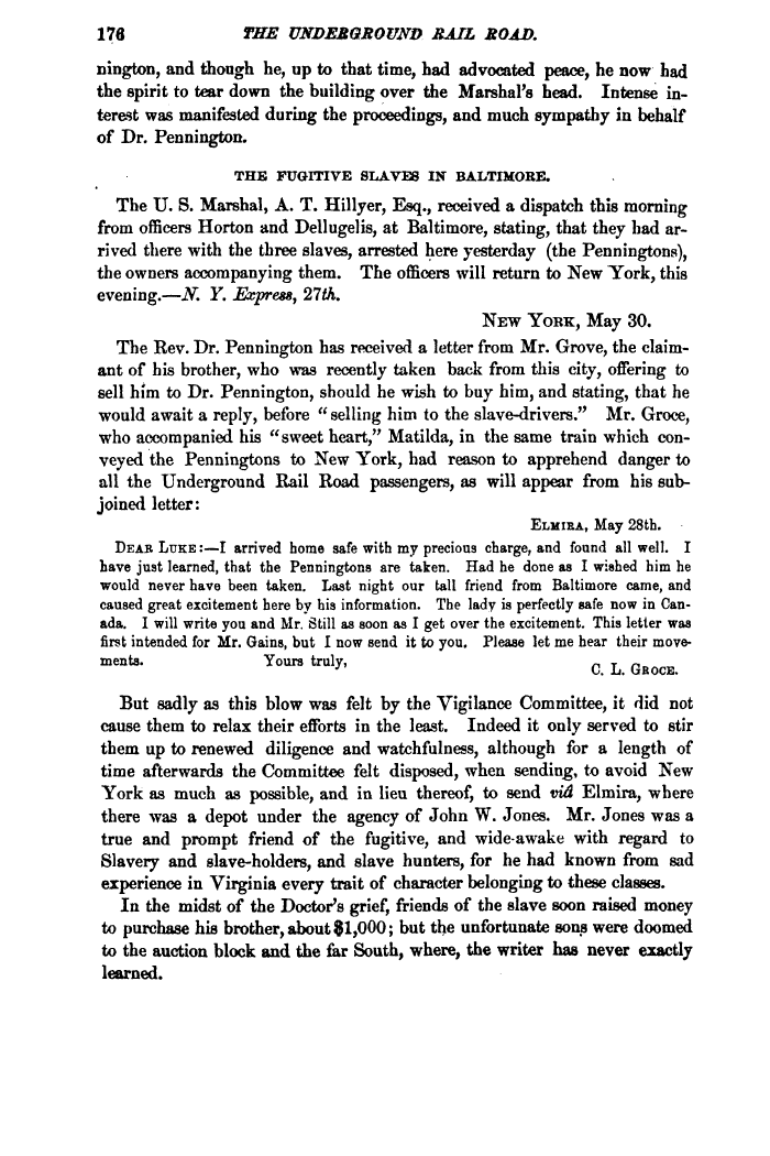 | 178 THE UNDE&QROVFD SAIL MOAD. nington, and though he, up to that time, had advocated peace, he now had the spirit to tear down the building over the Marshal's head. Intense interest was manifested daring the proceedings, and much sympathy in behalf of Dr. Pennington. THE FUGITIVE SLAVES IN BALTIMORE. The U. S. Marshal, A. T. Hillyer, Esq., received a dispatch this morning from officers Horton and Dellugelis, at Baltimore, stating, that they had arrived there with the tbree slaves, arrested here yesterday (the Penningtona), the owners accompanying them. The officers will return to New York, this evening.—JV". Y. Express, 27th. NEW YORK, May 30. The Rev. Dr. Pennington has received a letter from Mr. Grove, the claimant of his brother, who was recently taken back from this city, offering to sell him to Dr. Pennington, should he wish to buy him, and stating, that he would await a reply, before " selling him to the slave-drivers." Mr. Groce, who accompanied his "sweet heart," Matilda, in the same train which conveyed the Penningtons to New York, had reason to apprehend danger to all the Underground Rail Road passengers, as will appear from his subjoined letter: ELMIRA, May 28th. DEAB LUKE :—I arrived home safe with my precious charge, and found all well. I have just learned, that the Penningtons are taken. Had he done as I wished him he would never have been taken. Last night our tall friend from Baltimore came, and caused great excitement here by his information. The lady is perfectly safe now in Canada. I will write you and Mr. Still as soon as I get over the excitement. This letter was first intended for Mr. Gains, but I now send it to you. Please let me hear their move-ments. Yours truly, c L GROCE But sadly as this blow was felt by the Vigilance Committee, it did not cause them to relax their efforts in the least. Indeed it only served to stir them up to renewed diligence and watchfulness, although for a length of time afterwards the Committee felt disposed, when sending, to avoid New York as much as possible, and in lieu thereof, to send vid Elmira, where there was a depot under the agency of John W. Jones. Mr. Jones was a true and prompt friend of the fugitive, and wide-awake with regard to Slavery and slave-holders, and slave hunters, for he had known from sad experience in Virginia every trait of character belonging to these classes. In the midst of the Doctor's grief, friends of the slave soon raised money to purchase his brother, about $1,000; but the unfortunate sons were doomed to the auction block and the far South, where, the writer has never exactly learned. |