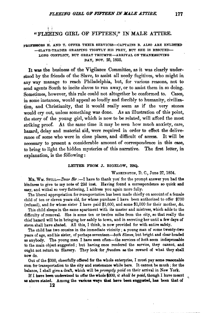 It was the business of the Vigilance Committee, as it was clearly understood by the friends of the Slave, to assist all needy fugitives, who might in, any way manage to reach Philadelphia, but, for various reasons, not to send agents South to incite slaves to run away, or to assist them in so doing. Sometimes, however, this rule could not altogether be conformed to. Cases, in some instances, would appeal so loudly and forcibly to humanity, civilization, and Christianity, that it would really seem as if the very stones would cry out, unless something was done. As an illustration of this point, the story of the young girl, which is now to be related, will afford the most striking proof. At the same time it may be seen how much anxiety, care, hazard, delay and material aid, were required in order to effect the deliverance of some who were in close places, and difficult of access. It will be necessary to present a considerable amonnt of correspondence in this case, to bring to light the hidden mysteries of this narrative. The first letter, in explanation, is the following: