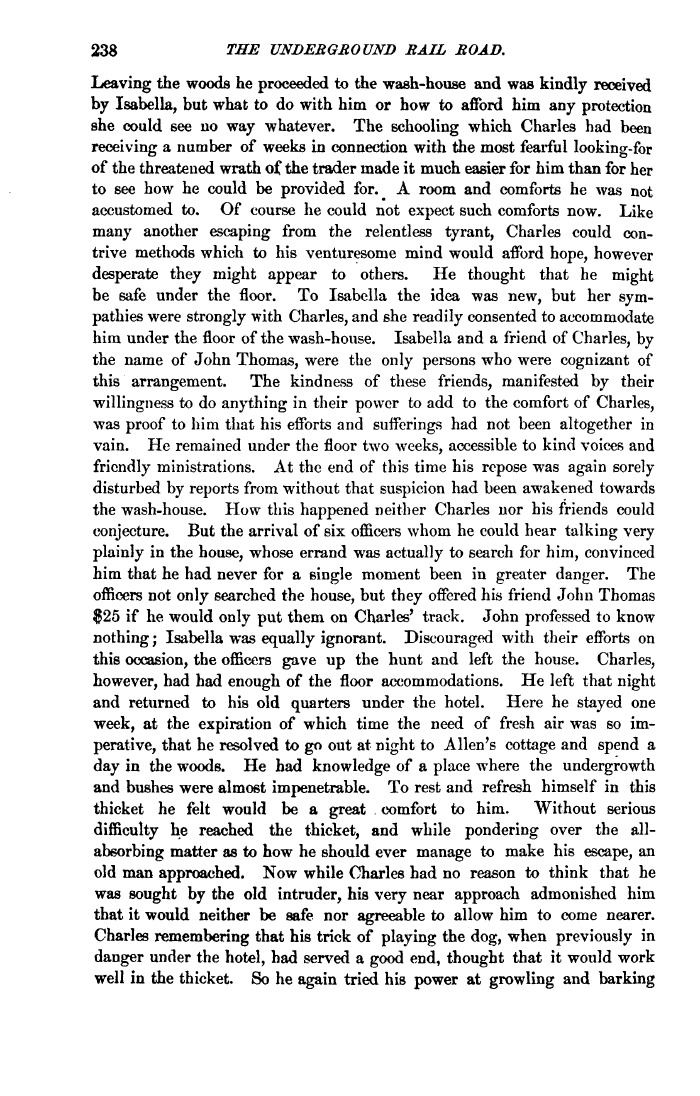 | 238 the UNDERGROUND MAIL ROAD. Leaving the woods he proceeded to the wash-house and was kindly received by Isabella, but what to do with him or how to afford him any protection she could see 110 way whatever. The schooling which Charles had been receiving a number of weeks in connection with the most fearful looking-for of the threatened wrath of the trader made it much easier for him than for her to see how he could be provided for. A room and comforts he was not accustomed to. Of course he could not expect such comforts now. Like many another escaping from the relentless tyrant, Charles could contrive methods which to his venturesome mind would afford hope, however desperate they might appear to others. He thought that he might be safe under the floor. To Isabella the idea was new, but her sympathies were stroogly with Charles, and she readily consented to accommodate him under the floor of the wash-house. Isabella and a friend of Charles, by the name of John Thomas, were the only persons who were cognizant of this arrangement. The kindness of these friends, manifested by their willingness to do anything in their power to add to the comfort of Charles, was proof to him that his efforts and sufferings had not been altogether in vain. He remained under the floor two weeks, accessible to kind voices and friendly ministrations. At the end of this time his repose was again sorely disturbed by reports from without that suspicion had been awakened towards the wash-house. How this happened neither Charles nor his friends could conjecture. But the arrival of six officers whom he could hear talking very plainly in the house, whose errand was actually to search for him, convinced him that he had never for a single moment been in greater danger. The officers not only searched the house, but they offered his friend John Thomas $25 if he would only put them on Charles' track. John professed to know nothing; Isabella was equally ignorant. Discouraged with their efforts on this occasion, the officers gave up the hunt and left the house. Charles, however, had had enough of the floor accommodations. He left that night and returned to his old quarters under the hotel. Here he stayed one week, at the expiration of which time the need of fresh air was so imperative, that he resolved to go out at night to Alien's cottage and spend a day in the woods. He had knowledge of a place where the undergrowth and bushes were almost impenetrable. To rest and refresh himself in this thicket he felt would be a great comfort to him. Without serious difficulty he reached the thicket, and while pondering over the all-absorbing matter as to how he should ever manage to make his escape, an old man approached. Now while Charles had no reason to think that he was sought by the old intruder, his very near approach admonished him that it would neither be safe nor agreeable to allow him to come nearer. Charles remembering that his trick of playing the dog, when previously in danger under the hotel, had served a good end, thought that it would work well in the thicket. So he again tried his power at growling and barking |
