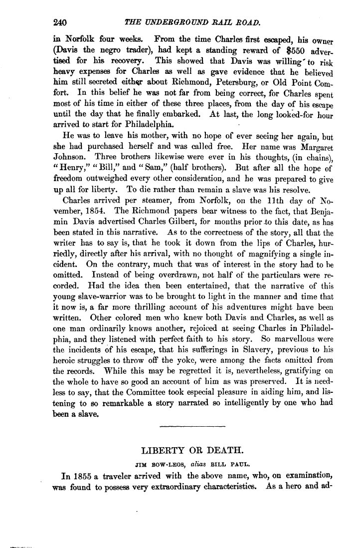 | 240 THE UNDERGROUND RAIL ROAD. in Norfolk four weeks. From the time Charles first escaped, his owner (Davis the negro trader), had kept a standing reward of $650 advertised for his recovery. This showed that Davis was willing'to risk heavy expenses for Charles as well as gave evidence that he believed him still secreted either about Richmond, Petersburg, or Old Point Comfort. In this belief he was not far from being correct, for Charles spent most of his time in either of these three places, from the day of his escape until the day that he finally embarked. At last, the long looked-for hour arrived to start for Philadelphia. He was to leave his mother, with no hope of ever seeing her again, but she had purchased herself and was called free. Her name was Margaret Johnson. Three brothers likewise were ever in his thoughts, (in chains), "Henry," "Bill," and "Sam," (half brothers). But after all the hope of freedom outweighed every other consideration, and he was prepared to give up all for liberty. To die rather than remain a slave was his resolve. Charles arrived per steamer, from Norfolk, on the llth day of November, 1854. The Richmond papers bear witness to the fact, that Benjamin Davis advertised Charles Gilbert, for months prior .to this date, as has been stated in this narrative. As to the correctness of the story, all that the writer has to say is, that he took it down from the lips of Charles, hurriedly, directly after his arrival, with no thought of magnifying a single incident. On the contrary, much that was of interest in the story had to be omitted. Instead of being overdrawn, not half of the particulars were recorded. Had the idea then been entertained, that the narrative of this young slave-warrior was to be brought to light in the manner and time that it now is, a far more thrilling account of his adventures might have been written. Other colored men who knew both Davis and Charles, as well as one man ordinarily knows another, rejoiced at seeing Charles in Philadelphia, and they listened with perfect faith to his story. So marvellous were the incidents of his escape, that his sufferings in Slavery, previous to his heroic struggles to throw off the yoke, were among the facts omitted from the records. While this may be regretted it is, nevertheless, gratifying on the whole to have so good an account of him as was preserved. It is needless to say, that the Committee took especial pleasure in aiding him, and listening to so remarkable a story narrated so intelligently by one who had been a slave. LIBERTY OR DEATH. JIM BOW-LEGS, alias BILL PAUL. In 1855 a traveler arrived with the above name, who, on examination, was found to possess very extraordinary characteristics. As a hero and ad- |