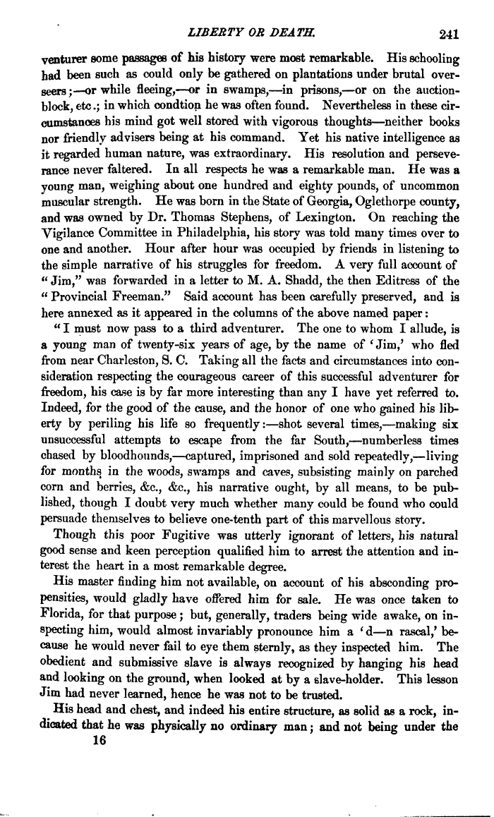 | LIBERTY OB DEATH. 241 venturer some passages of his history were most remarkable. His schooling had been such as could only be gathered on plantations under brutal overseers;—or while fleeing,—or in swamps,—in prisons,—or on the auction-block, etc.; in which oondtion he was often found. Nevertheless in these circumstances his mind got well stored with vigorous thoughts—neither books nor friendly advisers being at his command. Yet his native intelligence as it regarded human nature, was extraordinary. His resolution and perseverance never faltered. In all respects he was a remarkable man. He was a young man, weighing about one hundred and eighty pounds, of uncommon muscular strength. He was born in the State of Georgia, Oglethorpe county, and was owned by Dr. Thomas Stephens, of Lexington. On reaching the Vigilance Committee in Philadelphia, his story was told many times over to one and another. Hour after hour was occupied by friends in listening to the simple narrative of his struggles for freedom. A very full account of " Jim," was forwarded in a letter to M. A. Shadd, the then Editress of the " Provincial Freeman." Said account has been carefully preserved, and is here annexed as it appeared in the columns of the above named paper: " I must now pass to a third adventurer. The one to whom I allude, is a young man of twenty-six years of age, by the name of ' Jim/ who fled from near Charleston, S. C. Taking all the facts and circumstances into consideration respecting the courageous career of this successful adventurer for freedom, his case is by far more interesting than any I have yet referred to. Indeed, for the good of the cause, and the honor of one who gained his liberty by periling his life so frequently:—shot several times,—making six unsuccessful attempts to escape from the far South,—numberless times chased by bloodhounds,—captured, imprisoned and sold repeatedly,—living for months in the woods, swamps and caves, subsisting mainly on parched corn and berries, &c., &c., his narrative ought, by all means, to be published, though I doubt very much whether many could be found who could persuade themselves to believe one-tenth part of this marvellous story. Though this poor Fugitive was utterly ignorant of letters, his natural good sense and keen perception qualified him to arrest the attention and interest the heart in a most remarkable degree. His master finding him not available, on account of his absconding propensities, would gladly have offered him for sale. He was once taken to Florida, for that purpose; but, generally, traders being wide awake, on inspecting him, would almost invariably pronounce him a ' d—n rascal,' because he would never fail to eye them sternly, as they inspected him. The obedient and submissive slave is always recognized by hanging his head and looking on the ground, when looked at by a slave-holder. This lesson Jim had never learned, hence he was not to be trusted. His head and chest, and indeed his entire structure, as solid as a rock, indicated that he was physically no ordinary man; and not being under the 16 |