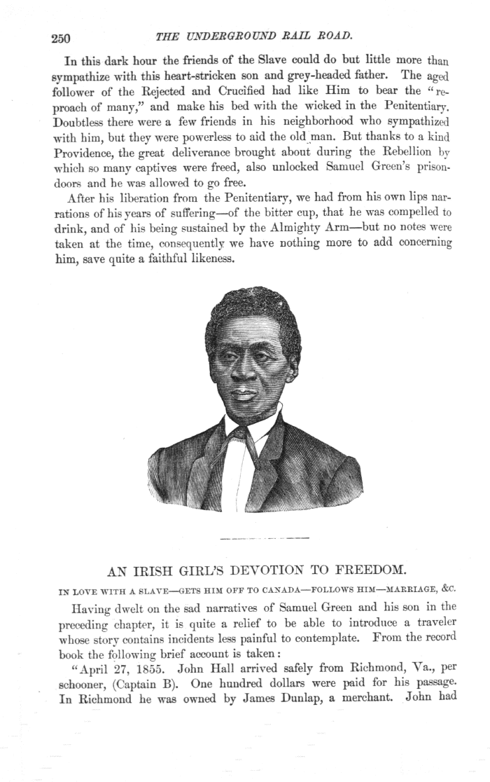 | 250 THE UNDERGROUND RAIL ROAD. In this dark hour the friends of the Slave could do but little more than sympathize with this heart-stricken son and grey-headed father. The aged follower of the Rejected and Crucified had like Him to bear the "reproach of many," and make his bed with the wicked in the Penitentiary. Doubtless there were a few friends in his neighborhood who sympathized with him, but they were powerless to aid the old man. But thanks to a kind Providence, the great deliverance brought about during the Rebellion by which so many captives were freed, also unlocked Samuel Green's prison-doors and he was allowed to go free. After his liberation from the Penitentiary, we had from his own lips narrations of his years of suffering—of the bitter cup, that he was compelled to drink, and of his being sustained by the Almighty Arm—but no notes were taken at the time, consequently we have nothing more to add concerning him, save quite a faithful likeness. AN IRISH GIRL'S DEVOTION TO FREEDOM. IN LOVE WITH A SLAVE—GETS HIM OFF TO CANADA—FOLLOWS HIM—MARRIAGE, &C. Having dwelt on the sad narratives of Samuel Green and his son in the preceding chapter, it is quite a relief to be able to introduce a traveler whose story contains incidents less painful to contemplate. From the record book the following brief account is taken : "April 27, 1855. John Hall arrived safely from Richmond, Va., per schooner, (Captain B). One hundred dollars were paid for his passage. In Richmond he was owned by James Dunlap, a merchant. John had |