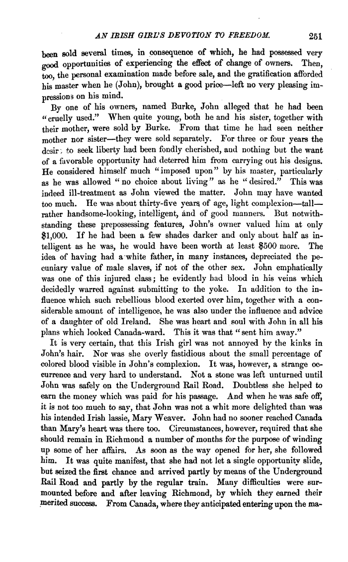 | AN IRISH GIRL'S DEVOTION TO FREEDOM. 251 been sold several times, in consequence of which, he had possessed very good opportunities of experiencing the effect of change of owners. Then, too, the personal examination made before sale, and the gratification afforded his master when he (John), brought a good price—left no very pleasing impressions on his mind. By one of his owners, named Burke, John alleged that he had been " cruelly used." When quite young, both he and his sister, together with their mother, were sold by Burke. From that time he had seen neither mother nor sister—they were sold separately. For three or four years the dcsir; to seek liberty had been fondly cherished, aud nothing but the want of a favorable opportunity had deterred him from carrying out his designs. He considered himself much "imposed upon" by his master, particularly as he was allowed " no choice about living" as he " desired." This was indeed ill-treatment as John viewed the matter. John may have wanted too much. He was about thirty-five years of age, light complexion—tall— rather handsome-looking, intelligent, and of good manners. But notwithstanding these prepossessing features, John's owner valued him at only $1,000. If he had been a few shades darker and only about half as intelligent as he was, he would have been worth at least $500 more. The idea of having had a white father, in many instances, depreciated the pecuniary value of male slaves, if not of the other sex. John emphatically was one of this injured class; he evidently had blood in his veins which decidedly warred against submitting to the yoke. In addition to the influence which such rebellious blood exerted over him, together with a considerable amount of intelligence, he was also under the influence and advice of a daughter of old Ireland. She was heart and soul with John in all his plans which looked Canada-ward. This it was that "sent him away." It is very certain, that this Irish girl was not annoyed by the kinks in John's hair. Nor was she overly fastidious about the small percentage of colored blood visible in John's complexion. It was, however, a strange occurrence and very hard to understand. Not a stone was left unturned until John was safely on the Underground Rail Road. Doubtless she helped to earn the money which was paid for his passage. And when he was safe off, it is not too much to say, that John was not a whit more delighted than was his intended Irish lassie, Mary Weaver. John had no sooner reached Canada than Mary's heart was there too. Circumstances, however, required that she should remain in Richmond a number of months for the purpose of winding up some of her affairs. As soon as the way opened for her, she followed him. It was quite manifest, that she had not let a single opportunity slide, but seized the first chance and arrived partly by means of the Underground Rail Road and partly by the regular train. Many difficulties were surmounted before and after leaving Richmond, by which they earned their merited success. From Canada, where they anticipated entering upon the ma- |