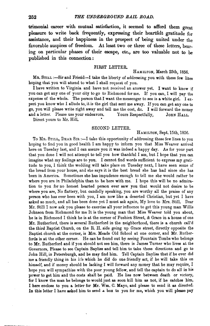 | 252 THE UNDERGROUND RAIL ROAD. tfimonial career with mutual satisfaction, it seemed to afford them great pleasure to write back frequently, expressing their heartfelt gratitude for assistance, and their happiness in the prospect of being united under the favorable auspices of freedom. At least two or three of these letters, bearing on particular phases of their escape, etc., are too valuable not to be published in this connection: FIRST LETTER. HAMILTON, March 25th, 1856. ME. STILL :—Sir and Friend—I take the liberty of addressing you. with these few lines hoping that you will attend to what I shall request of you. I have written to Virginia and have not received an answer yet. I want to know if you can get any one of your city to go to Richmond for me. If you can, I will pay the expense of the whole. The person that I want the messenger to see is a white girl. I expect you know who I allude to, it is the girl that sent me away. If you can get any one to go, you will please write right away and tell me the cost, &c. I will forward the money and a letter. Please use your endeavors. Yours Respectfully, JOHN HALL. Direct yours to Mr. HilL * SECOND LETTER. HAMILTON, Sept. 15th, 1856. To ME. STILL, BEAK SIR :—I take this opportunity of addressing these few lines to you hoping to find you in good health I am happy to inform you that Miss Weaver arrived here on Tuesday last, and I can assure you it was indeed a happy day. As for your part that you done I will not attempt to tell you how thankful I am, but I hope that you can imagine what my feelings are to you. I cannot find words sufficient to express my gratitude to you, I think the wedding will take place on Tuesday next, I have seen some of the bread from your house, and she says it is the best bread she has bad since she has been in America. Sometimes she has impudence enough to tell me she would rather be where you are in Philadelphia than to be here with me. I hope this will be no admiration to you for no honest hearted person ever saw you that would not desire to be where you are, No flattery, but candidly speaking, you are worthy all the praise of any person who has ever been with you, I am now like a deserted Christian, but yet I have asked so much, and all has been done yet I must ask again, My love to Mrs. Still. Dear Mr. Still I now ask you please to exercise all your influence to get this young man Willis Johnson from Richmond for me It is the young man that Miss Weaver told you about, he is in Richmond I think he is at the corner of Fushien Street, & Grace in a house of one Mr. Rutherford, there is several Rutherford in the neighborhood, there is a church call'd the third Baptist Church, on the R. H. side going up Grace street, directly opposite the Baptist church at the corner, is Mrs. Meads Old School at one corner, and Mr. Ruther-fords is at the other corner. He can be found out by seeing Fountain Tombs who belongs to Mr. Rutherford and if you should not see him, there is James Turner who lives at the Governors, Please to see Captain Bayliss and tell him to take these directions and go to John Hill, in Petersburgh, and he may find him. Tell Captain Bayliss that if he ever did me a friendly thing in his life which he did do one friendly act, if he will take this on himself, and if money should be lacking I will forward any money that he may require, I hope you will sympathize with the poor young fellow, and tell the captain to do all in his power to get him and the costs shall be paid. He lies now between death or victory, for I know the man he belongs to would just as soon kill him as not, if he catches him, I here enclose to you a letter for Mr. Wm. C. Mayo, and please to send it as directed. In this letter I have asked him to send a box to you for me, which you will please pay |