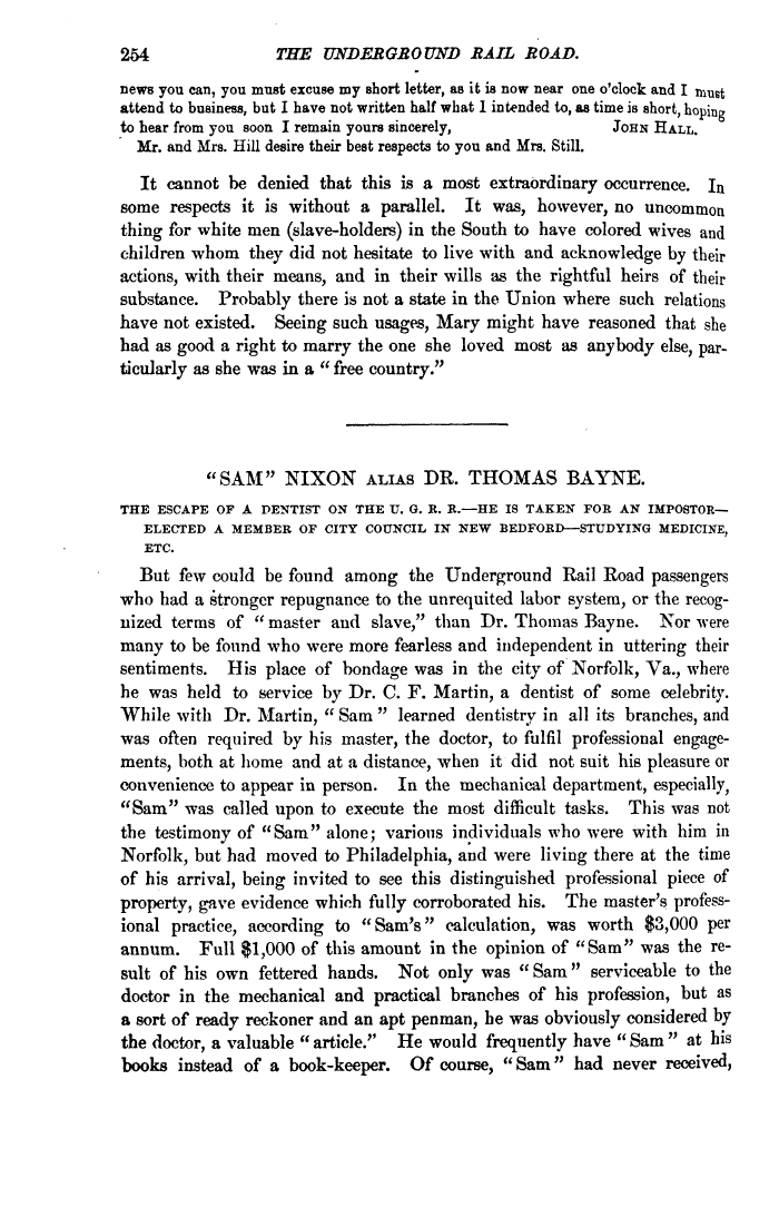 | 254 THE UNDERGROUND RAIL ROAD. news you can, you must excuse my short letter, as it ia now near one o'clock and I must attend to business, but I have not written half what I intended to, as time is short, hoping to hear from you soon I remain yours sincerely, JOHN HALL. Mr. and Mrs. Hill desire their beat respects to you and Mrs. Still. It cannot be denied that this is a most extraordinary occurrence. Iu some respects it is without a parallel. It was, however, no uncommon thing for white men (slave-holders) in the South to have colored wives and children whom they did not hesitate to live with and acknowledge by their actions, with their means, and in their wills as the rightful heirs of their substance. Probably there is not a state in the Union where such relations have not existed. Seeing such usages, Mary might have reasoned that she had as good a right to marry the one she loved most as anybody else, particularly as she was in a " free country." "SAM" NIXON ALIAS DR. THOMAS BAYNE. THE ESCAPE OF A DENTIST ON THE U. G. B. K.—HE IS TAKEN FOR AN IMPOSTOR-ELECTED A MEMBER OF CITY COUNCIL IN NEW BEDFORD—STUDYING MEDICINE, ETC. But few could be found among the Underground Rail Road passengers who had a stronger repugnance to the unrequited labor system, or the recognized terras of " master and slave," than Dr. Thomas Bayne. Nor were many to be found who were more fearless and independent in uttering their sentiments. His place of bondage was in the city of Norfolk, Va., where he was held to service by Dr. C. F. Martin, a dentist of some celebrity. While with Dr. Martin, " Sam " learned dentistry in all its branches, and was often required by his master, the doctor, to fulfil professional engagements, both at home and at a distance, when it did not suit his pleasure or convenience to appear in person. In the mechanical department, especially, "Sam" was called upon to execute the most difficult tasks. This was not the testimony of "Sam" alone; various individuals who were with him in Norfolk, but had moved to Philadelphia, and were living there at the time of his arrival, being invited to see this distinguished professional piece of property, gave evidence which fully corroborated his. The master's professional practice, according to "Sam's" calculation, was worth $3,000 per annum. Full $1,000 of this amount in the opinion of "Sam" was the result of his own fettered hands. Not only was " Sam" serviceable to the doctor in the mechanical and practical branches of his profession, but as a sort of ready reckoner and an apt penman, he was obviously considered by the doctor, a valuable " article/' He would frequently have " Sam " at his books instead of a book-keeper. Of course, " Sam" had never received, |