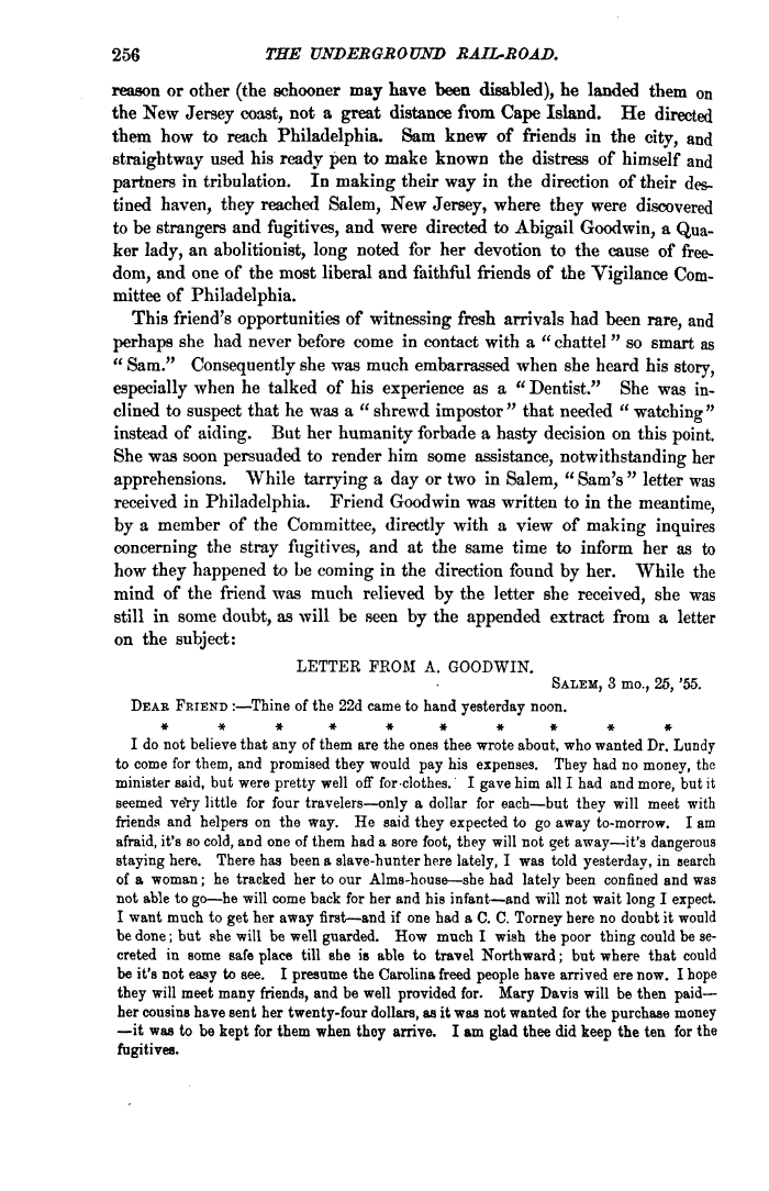 | 256 THE UNDERGROUND RAIL-ROAD. reason or other (the schooner may have been disabled), he landed them on the New Jersey coast, not a great distance from Cape Island. He directed them how to reach Philadelphia. Sam knew of friends in the city, and straightway used his ready pen to make known the distress of himself and partners in tribulation. In making their way in the direction of their destined haven, they reached Salem, New Jersey, where they were discovered to be strangers and fugitives, and were directed to Abigail Goodwill, a Quaker lady, an abolitionist, long noted for her devotion to the cause of freedom, and one of the most liberal and faithful friends of the Vigilance Committee of Philadelphia. This friend's opportunities of witnessing fresh arrivals had been rare, and perhaps she had never before come in contact with a " chattel " so smart as " Sam." Consequently she was much embarrassed when she heard his story, especially when he talked of his experience as a " Dentist." She was inclined to suspect that he was a "shrewd impostor" that needed " watching" instead of aiding. Bat her humanity forbade a hasty decision on this point. She was soon persuaded to render him some assistance, notwithstanding her apprehensions. While tarrying a day or two in Salem, " Sam's " letter was received in Philadelphia. Friend Goodwill was written to in the meantime, by a member of the Committee, directly with a view of making inquires concerning the stray fugitives, and at the same time to inform her as to how they happened to be coming in the direction found by her. While the mind of the friend was much relieved by the letter she received, she was still in some doubt, as will be seen by the appended extract from a letter on the subject: LETTER FROM A. GOODWIN. SALEM, 3 mo., 25, '55. DEAE FRIEND :—Thine of the 22d came to hand yesterday noon. #*##*#**** I do not believe that any of them are the ones thee wrote about, who wanted Dr. Lundy to come for them, and promised they would pay his expenses. They had no money, the minister said, but were pretty well off for-clothes. I gave him all I had and more, but it seemed veYy little for four travelers—only a dollar for each—but they will meet with friends and helpers on the way. He said they expected to go away to-morrow. I am afraid, it's so cold, and one of them had a sore foot, they will not get away—it's dangerous staying here. There has been a slave-hunter here lately, I was told yesterday, in search of a woman; he tracked her to our Alms-house—she had lately been confined and was not able to go—he will come back for her and his infant—and will not wait long I expect. I want much to get her away first—and if one had a C. C. Torney here no doubt it would be done; but she will be well guarded. How much I wish the poor thing could be secreted in some safe place till she is able to travel Northward; but where that could be it's not easy to see. I presume the Carolina freed people have arrived ere now. I hope they will meet many friends, and be well provided for. Mary Davis will be then paid— her cousins have sent her twenty-four dollars, as it was not wanted for the purchase money —it was to be kept for them when they arrive. I am glad thee did keep the ten for the fugitives. |