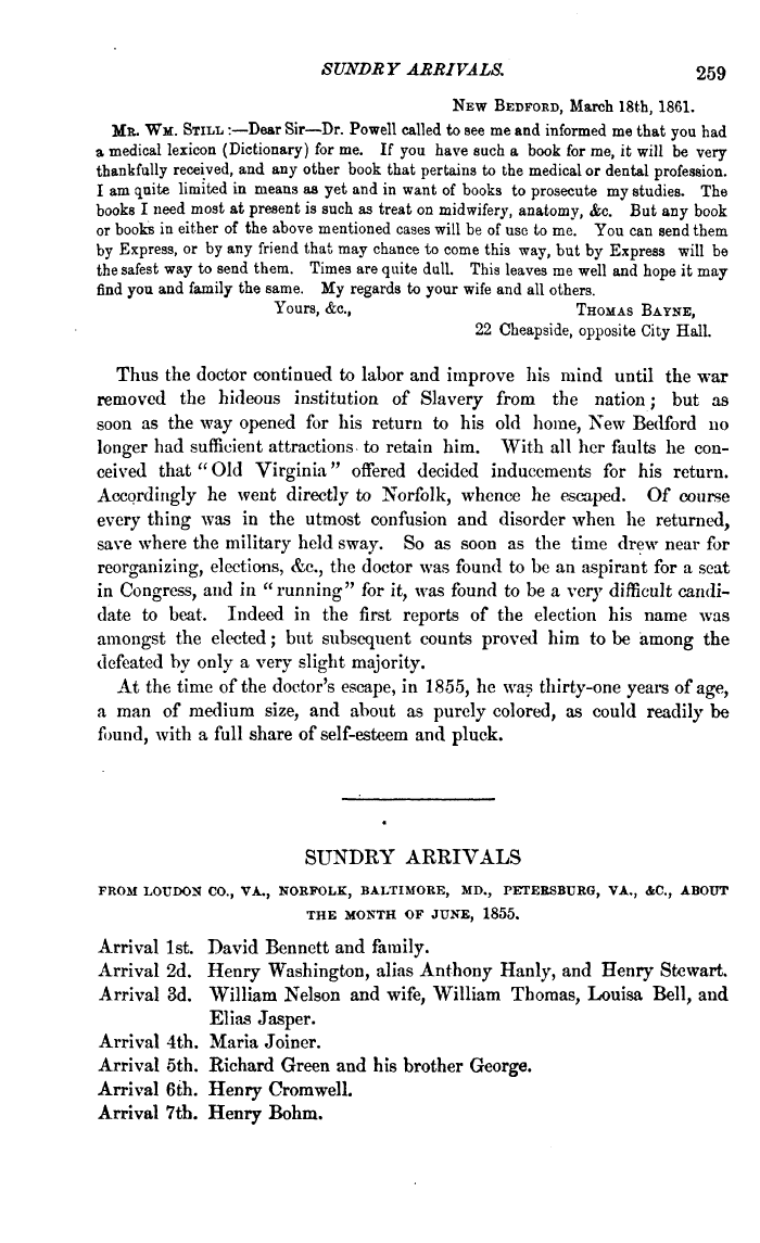 Ma. WM. STILL :—Dear Sir—Dr. Powell called to see me and informed me that you had a medical lexicon (Dictionary) for me. If you have such a book for me, it will be very thankfully received, and any other book that pertains to the medical or dental profession. I am quite limited in means as yet and in want of books to prosecute my studies. The books I need most at present is such as treat on midwifery, anatomy, &c. But any book or books in either of the above mentioned cases will be of use to me. You can send them by Express, or by any friend that may chance to come this way, but by Express will be the safest way to send them. Times are quite dull. This leaves me well and hope it may find you and family the same. My regards to your wife and all others.