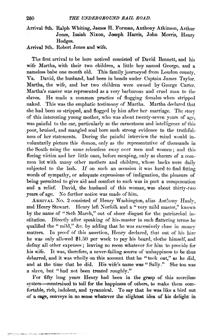 | 260 THE UNDERGROUND RAIL ROAD. Arrival 8th. Ralph Whiting, James H. Forman, Anthony Atkinson, Arthur Jones, Isaiah Nixon, Joseph Harris, John Morris, Henry Hodges. Arrival 9th. Robert Jones and wife. The first arrival to be here noticed consisted of David Bennett, and his wife Martha, with their two children, a little boy named George, and a nameless babe one month old. This family journeyed from Loudon county, Va. David, the husband, had been in bonds under Captain James Taylor. Martha, the wife, and her two children were owned by George Carter. Martha's master was represented as a very barbarous and cruel man to the slaves. He made a common practice of flogging females when stripped naked. This was the emphatic testimony of Martha. Martha declared that she had been so stripped, and flogged by him after her marriage. The story of this interesting young mother, who was about twenty-seven years of a#t>, was painful to the ear, particularly as the earnestness and intelligence of this poor, bruised, and mangled soul bore such strong evidence to the truthfulness of her statements. During the painful interview the mind would involuntarily picture this demon, only as the representative of thousands in the South rising the same relentless sway over men and women ; and this fleeing victim and her little ones, before escaping, only as sharers of a common lot with many other mothers and children, whose backs were daily subjected to the lash. If on such an occasion it was hard to find fitting words of sympathy, or adequate expressions of indignation, the pleasure of being permitted to give aid and comfort to such was in part a compensation and a relief. David, the husband of this woman, was about thirty-two years of age. No further notice was made of him. ARRIVAL, No. 2 consisted of Henry Washington, alias Anthony Hanly, and Henry Stewart. Henry left Norfolk and a " very mild master," kncnvn by the name of " Seth March," out of sheer disgust for the patriarchal institution. Directly after speaking of his.master in such flattering terms he qualified the " mild," &e. by adding that he was excessively close in money matters. In proof of this assertion, Henry declared, that out of his hire he was only allowed $1.50 per week to pay his board, clothe himself, and defray all other expenses ; leaving no room whatever for him to provide for his wife. It was, therefore, a never-failing source of unlmppiness to be thus debarred, and it was wholly on this account that he " took out," as he did, and at the time that he did. His wife's name was " Sally." She too was a slave, but " had not been treated roughly." For fifty long years Henry had been in the grasp of this merciless system—constrained to toil for the happiness of others, to make them comfortable, rich, indolent, and tyrannical. To say that he was like a bird out of a cage, conveys in no sense whatever the slightest idea of his delight in |