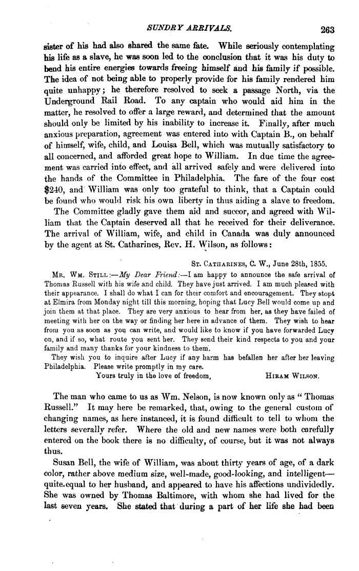 | SUNDRY ARRIVALS. 263 sister of his had also shared the same fate. While seriously contemplating his life as a slave, he was soon led to the conclusion that it was his duty to bend his entire energies towards freeing himself and his family if possible. The idea of not being able to properly provide for his family rendered him quite unhappy; he therefore resolved to seek a passage North, via the Underground Rail Road. To any captain who would aid him in the matter, he resolved to offer a large reward, and determined that the amount should only be limited by his inability to increase it. Finally, after much anxious preparation, agreement was entered into with Captain B., on behalf of himself, wife, child, and Louisa Bell, which was mutually satisfactory to all concerned, and afforded great hope to William. In due time the agreement was carried into effect, and all arrived safely and were delivered into the hands of the Committee in Philadelphia. The fare of the four cost $240, and William was only too grateful to think, that a Captain could be found who would risk his own liberty in thus aiding a slave to freedom. The Committee gladly gave them aid and succor, and agreed with William that the Captain deserved all that he received for their deliverance. The arrival of William, wife, and child in Canada was duly announced by the agent at St. Catharines, Kev. H. Wilson, as follows: ST. CATHARINES, C. W., June 28th, 1855. ME. WM. STILL:—My Dear Friend:—I am happy to announce the safe arrival of Thomas Russell with his wife and child. They have just arrived. I am much pleased with their appearance. I shall do what I can for their comfort and encouragement. They stopt at Elmira from Monday night till this morning, hoping that Lucy Bell would come up and join them at that place. They are very anxious to hear from her, as they have failed of meeting with her on the way or finding her here in advance of them. They wish to hear from you as soon as you can write, and would like to know if you have forwarded Lucy on, and if so, what route you sent her. They send their kind respects to you and your family and many thanks for your kindness to them. They wish you to inquire after Lucy if any harm has befallen her after her leaving Philadelphia. Please write promptly in my care. Yours truly in the love of freedom, HIRAM WILSON. The man who came to us as Wm. Nelson, is now known only as " Thomas Russell." It may here be remarked, that, owing to the general custom of changing names, as here instanced, it is found difficult to tell to whom the letters severally refer. Where the old and new names were both carefully entered on the book there is no difficulty, of course, but it was not always thus. Susan Bell, the wife of William, was about thirty years of age, of a dark color, rather above medium size, well-made, good-looking, and intelligent— quite.equal to her husband, and appeared to have his affections undividedly. She was owned by Thomas Baltimore, with whom she had lived for the last seven years. She stated that during a part of her life she had been |