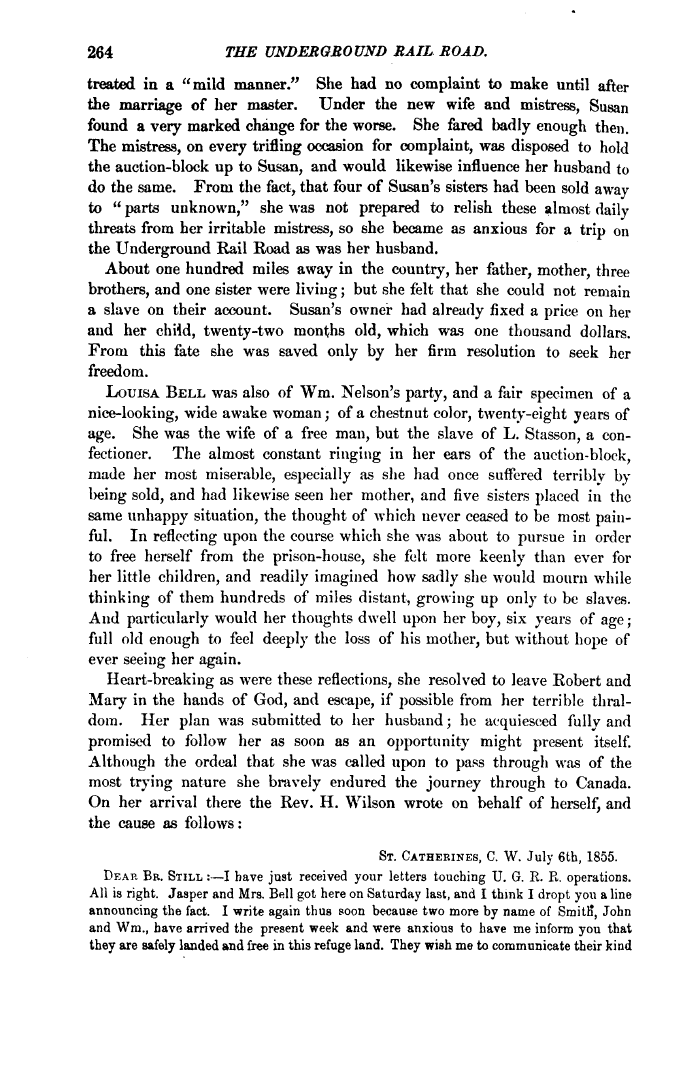 | 264 THE UNDERGROUND RAIL ROAD. treated in a "mild manner." She had no complaint to make until after the marriage of her master. Under the new wife and mistress, Susan found a very marked change for the worse. She fared badly enough then. The mistress, on every trifling occasion for complaint, was disposed to hold the auction-block up to Susan, and would likewise influence her husband to do the same. From the fact, that four of Susan's sisters had been sold away to " parts unknown," she was not prepared to relish these almost daily threats from her irritable mistress, so she became as anxious for a trip on the Underground Rail Road as was her husband. About one hundred miles away in the country, her father, mother, three brothers, and one sister were living; but she felt that she could not remain a slave on their account. Susan's owner had already fixed a price on her and her child, twenty-two months old, which was one thousand dollars. From this fate she was saved only by her firm resolution to seek her freedom. LOUISA BELL was also of Wm. Nelson's party, and a fair specimen of a nice-looking, wide awake woman; of a chestnut color, twenty-eight years of age. She was the wife of a free man, but the slave of L. Stasson, a confectioner. The almost constant ringing in her ears of the auction-block, made her most miserable, especially as she had once suffered terribly by l>eing sold, and had likewise seen her mother, and five sisters placed in the same unhappy situation, the thought of which never ceased to be most painful. In reflecting upon the course which she was about to pursue in order to free herself from the prison-house, she felt more keenly than ever for her little children, and readily imagined how sadly she would mourn while thinking of them hundreds of miles distant, growing up only to be slaves. And particularly would her thoughts dwell upon her boy, six years of age; full old enough to feel deeply the loss of his mother, but without hope of ever seeing her again. Heart-breaking as were these reflections, she resolved to leave Robert and Mary in the hands of God, and escape, if possible from her terrible thraldom. Her plan was submitted to her husband; he acquiesced fully and promised to follow her as soon as an opportunity might present itself. Although the ordeal that she was called upon to pass through was of the most trying nature she bravely endured the journey through to Canada. On her arrival there the Rev. H. Wilson wrote on behalf of herself, and the cause as follows: ST. CATHERINES, C. W. July 6th, 1855. DEAR BB. STILL :—I have just received your letters touching U. G. R. R. operations. All is right. Jasper and Mrs. Bell got here on Saturday last, and I think I dropt you a line announcing the fact. I write again thus soon because two more by name of Smitfi, John and Wm., have arrived the present week and were anxious to have me inform you that they are safely landed and free in this refuge land. They wish me to communicate their kind |
