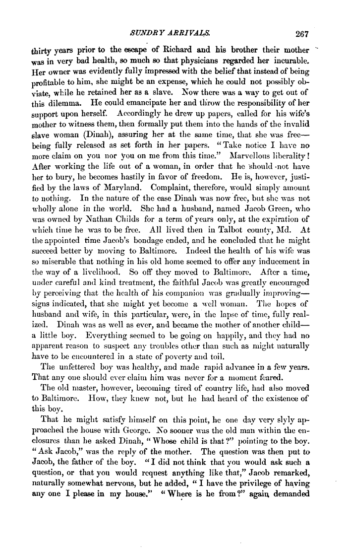 | SUNDRY ARRIVALS. 267 thirty years prior to the escape of Richard and his brother their mother was in very bad health, so much so that physicians regarded her incurable. Her owner was evidently fully impressed with the belief that instead of being profitable to him, she might be an expense, which he could not possibly obviate, while he retained her as a slave. Now there was a way to get out of this dilemma. He could emancipate her and throw the responsibility of her support upon herself. Accordingly he drew up papers, called for his wife's mother to witness them, then formally put them into the hands of the invalid slave woman (Dinah), assuring her at the same time, that she was free— being fully released as set forth in her papers. "Take notice I have no more claim on you nor you on me from this time." Marvellous liberality! After working the life out of a woman, in order that he should -not have her to bury, he becomes hastily in favor of freedom. He is, however, justified by the laws of Maryland. Complaint, therefore, would simply amount to nothing. In the nature of the case Dinah was now free, but she was not wholly alone in the world. She had a husband, named Jacob Green, who was owned by Nathan Childs for a term of years only, at the expiration of which time he was to be free. All lived then in Talbot county, Md. At the appointed time Jacob's bondage ended, and he concluded that he might succeed better by moving to Baltimore. Indeed the health of his wife was so miserable that nothing in his old home seemed to offer any inducement in the way of a livelihood. So off they moved to Baltimore. After a time, under careful and kind treatment, the faithful Jacob was greatly encouraged by perceiving that the health of his companion was gradually improving— signs indicated, that she might yet become a well woman. The hopes of husband and wife, in this particular, were, in the lapse of time, fully realized. Dinah was as well as ever, and became the mother of another child— a little boy. Everything seemed to be going on happily, and they had no apparent reason to suspect any troubles other than such as might naturally have to be encountered in a state of poverty and toil. The unfettered boy was healthy, and made rapid advance in a few years. That any one should ever claim him was never for a moment feared. The old master, however, becoming tired of country life, had also moved to Baltimore. How, they knew not, but he had heard of the existence of this boy. That he might satisfy himself on this point, lie one day very slyly approached the house with George. Xo sooner was the old man within the enclosures than he asked Dinah, " Whose child is that ?" pointing to the boy. " Ask Jacob," was the reply of the mother. The question was then put to Jacob, the father of the boy. " I did not think that you would ask such a question, or that you would request anything like that," Jacob remarked, naturally somewhat nervous, but he added, " I have the privilege of having anyone I please in my house." "Where is he from?" agaiu demanded |