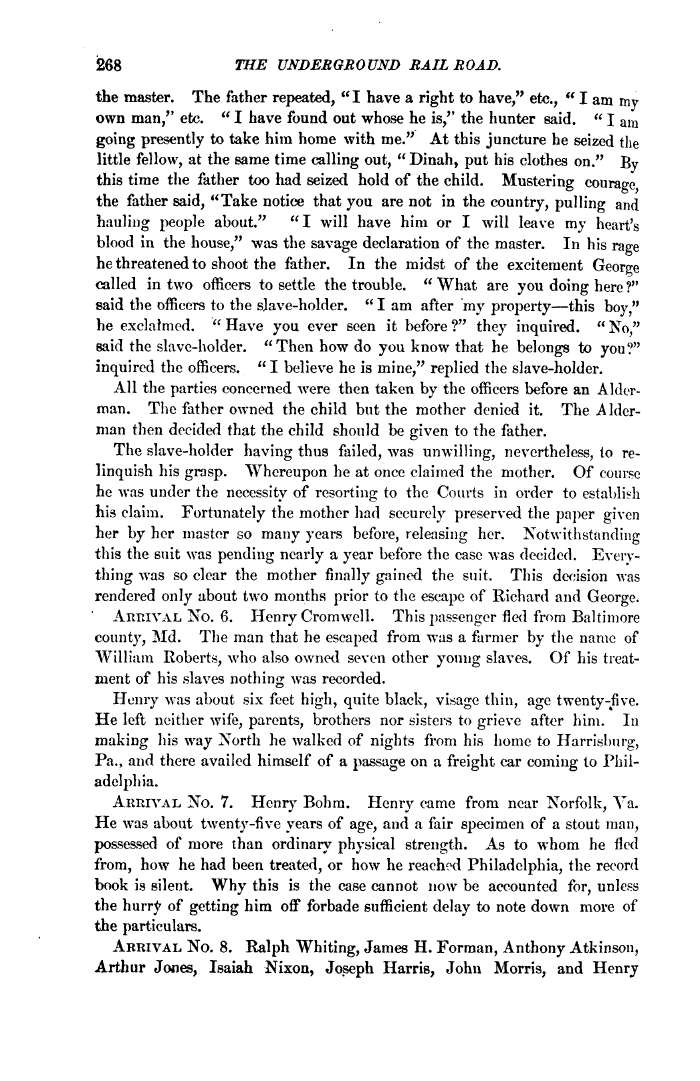 | 268 THE UNDERGROUND RAILROAD. the master. The father repeated, " I have a right to have," etc., " I am my own man/' etc. " I have found out whose he is/' the hunter said. " I am going presently to take him home with me." At this juncture he seized the little fellow, at the same time calling out, " Dinah, put his clothes on." By this time the father too had seized hold of the child. Mustering courage the father said, "Take notice that you are not in the country, pulling and hauling people about." "I will have him or I will leave my heart's blood in the house/' was the savage declaration of the master. In his rage he threatened to shoot the father. In the midst of the excitement George called in two officers to settle the trouble. " What are you doing here ?" said the officers to the slave-holder. " I am after my property—this boy," he exclaimed. " Have you ever seen it before ?" they inquired. " No," said the slave-holder. "Then how do you know that he belongs to you?" inquired the officers. "I believe he is mine," replied the slave-holder. All the parties concerned were then taken by the officers before an Alderman. The father owned the child but the mother denied it. The Alderman then decided that the child should be given to the father. The slave-holder having thus failed, was unwilling, nevertheless, to relinquish his grasp. Whereupon he at once claimed the mother. Of course he was under the necessity of resorting to the Courts in order to establish his claim. Fortunately the mother had securely preserved the paper given her by her master so many years before, releasing her. Notwithstanding this the suit was pending nearly a year before the case was decided. Everything was so clear the mother finally gained the suit. This decision was rendered only about two months prior to the escape of Richard and George. ARRIVAL No. 6. Henry Cromwell. This passenger fled from Baltimore county, Md. The man that he escaped from was a farmer by the name of William Roberts, who also owned seven other young slaves. Of his treatment of his slaves nothing was recorded. Homy was about six feet high, quite black, visage thin, age twenty-five. He left neither wife, parents, brothers nor sisters to grieve after him. In making his way North he walked of nights from his home to Harrislmrg, Pa., and there availed himself of a passage on a freight car coming to Philadelphia. ARRIVAL No. 7. Henry Bohm. Henry came from near Norfolk, Va. He was about twenty-five years of age, and a fair specimen of a stout man, possessed of more than ordinary physical strength. As to whom he fled from, how he had been treated, or how he reached Philadelphia, the record book is silent. Why this is the case cannot now be accounted for, unless the hurr^ of getting him off forbade sufficient delay to note down more of the particulars. ARRIVAL. No. 8. Ralph Whiting, James H. Forman, Anthony Atkinson, Arthur Jones, Isaiah Nixon, Joseph Harris, John Morris, and Henry |