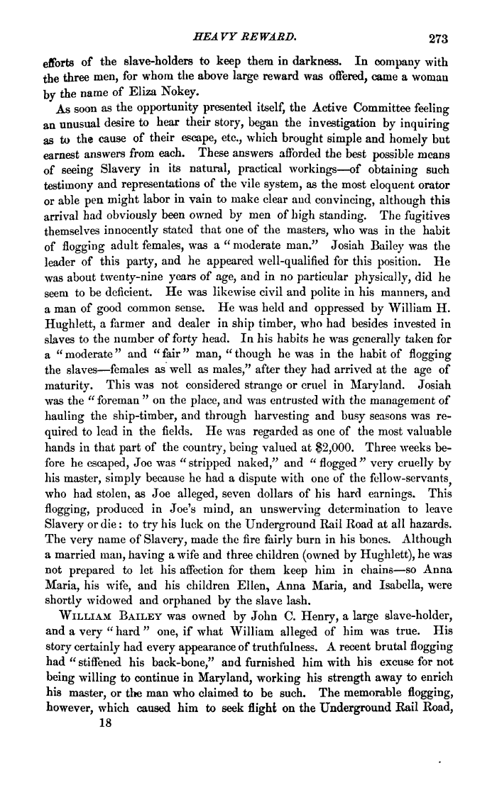 | hea VY REWARD. 273 efforts of the slave-holders to keep them in darkness. In company with the three men, for whom the above large reward was offered, came a woman by the name of Eliza. Nokey. As soon as the opportunity presented itself, the Active Committee feeling an unusual desire to hear their story, began the investigation by inquiring as to the cause of their escape, etc., which brought simple and homely but earnest answers from each. These answers afforded the best possible means of seeing Slavery in its natural, practical workings—of obtaining such testimony and representations of the vile system, as the most eloquent orator or able pen might labor in vain to make clear and convincing, although this arrival had obviously been owned by men of high standing. The fugitives themselves innocently stated that one of the masters, who was in the habit of flogging adult females, was a " moderate man." Josiah Bailey was the leader of this party, and he appeared well-qualified for this position. He was about twenty-nine years of age, and in no particular physically, did he seem to be deficient. He was likewise civil and polite in his manners, and a man of good common sense. He was held and oppressed by William H. Hughlett, a farmer and dealer in ship timber, who had besides invested in slaves to the number of forty head. In his habits he was generally taken for a " moderate" and " fair" man, " though he was in the habit of flogging the slaves—females as well as males," after they had arrived at the age of maturity. This was not considered strange or cruel in Maryland. Josiah was the " foreman " on the place, and was entrusted with the management of hauling the ship-timber, and through harvesting and busy seasons was required to lead in the fields. He was regarded as one of the most valuable hands in that part of the country, being valued at $2,000. Three weeks before he escaped, Joe was "stripped naked," and " flogged" very cruelly by his master, simply because he had a dispute with one of the fellow-servants^ who had stolen, as Joe alleged, seven dollars of his hard earnings. This flogging, produced in Joe's mind, an unswerving determination to leave Slavery or die: to try his luck on the Underground Rail Road at all hazards. The very name of Slavery, made the fire fairly burn in his bones. Although a married man, having a wife and three children (owned by Hughlett), he was not prepared to let his affection for them keep him in chains—so Anna Maria, his wife, and his children Ellen, Anna Maria, and Isabella, were shortly widowed and orphaned by the slave lash. WILLIAM BAILEY was owned by John C. Henry, a large slave-holder, and a very " hard " one, if what William alleged of him was true. His story certainly had every appearance of truthfulness. A recent brutal flogging had " stiffened his back-bone," and furnished him with his excuse for not being willing to continue in Maryland, working his strength away to enrich his master, or the man who claimed to be such. The memorable flogging, however, which caused him to seek flight on the Underground Rail Road, 18 |