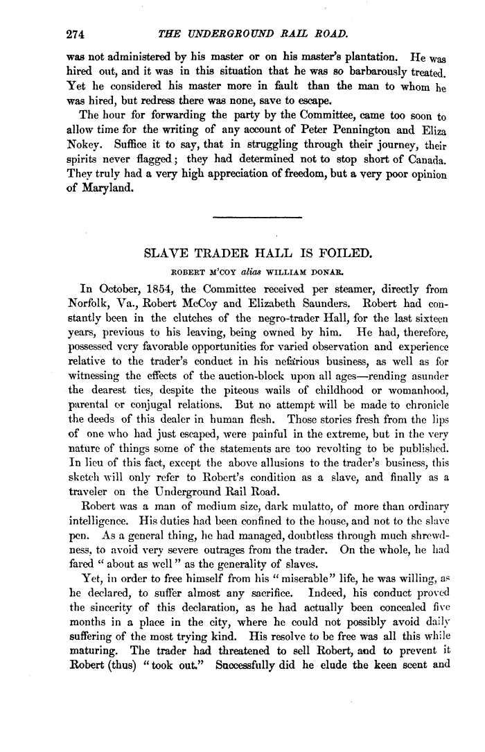 | 274 THE UNDERGROUND RAIL ROAD. was not administered by his master or on his master's plantation. He was hired out, and it was in this situation that he was so barbarously treated. Yet he considered his master more in fault than the man to whom he was hired, but redress there was none, save to escape. The hour for forwarding the party by the Committee, came too soon to allow time for the writing of any account of Peter Pennington and Eliza Nokey. Suffice it to say, that in struggling through their journey, their spirits never flagged; they had determined not to stop short of Canada. They truly had a very high appreciation of freedom, but a very poor opinion of Maryland. SLAVE TRADER HALL IS FOILED. ROBERT M'COY alias WILLIAM DONAR. In October, 1854, the Committee received per steamer, directly from Norfolk, Va., Robert McCoy and Elizabeth Saunders. Robert had constantly been in the clutches of the negro-trader Hall, for the last sixteen years, previous to his leaving, being owned by him. He had, therefore, possessed very favorable opportunities for varied observation and experience relative to the trader's conduct in his nefairious business, as well as for witnessing the effects of the auction-block upon all ages—rending asunder the dearest ties, despite the piteous wails of childhood or womanhood, parental or conjugal relations. But no attempt will be made to chronicle the deeds of this dealer in human flesh. Those stories fresh from the lips of one who had just escaped, were painful in the extreme, but in the very nature of things some of the statements are too revolting to be published. In lieu of this fact, except the above allusions to the trader's business, this sketch will only refer to Robert's condition as a slave, and finally as a traveler on the Underground Rail Road. Robert was a man of medium size, dark mulatto, of more than ordinary intelligence. His duties had been confined to the house, and not to the slave pen. As a general thing, he had managed, doubtless through much shrewdness, to avoid very severe outrages from the trader. On the whole, he had fared " about as well" as the generality of slaves. Yet, in order to free himself from his " miserable" life, he was willing, a? he declared, to suffer almost any sacrifice. Indeed, his conduct proved the sincerity of this declaration, as he had actually been concealed five months in a place in the city, where he could not possibly avoid daily suffering of the most trying kind. His resolve to be free was all this while maturing. The trader had threatened to sell Robert, and to prevent it Robert (thus) " took out," Successfully did he elude the keen scent and |