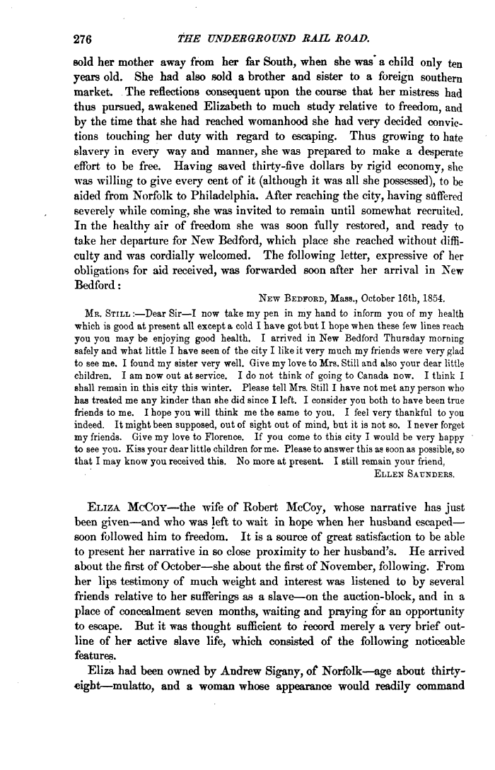 | 276 TEE UNDERGROUND RAIL ROAD. sold her mother away from her far South, when she was a child only ten years old. She had also sold a brother and sister to a foreign southern market. The reflections consequent upon the course that her mistress had thus pursued, awakened Elizabeth to much study relative to freedom, and by the time that she had reached womanhood she had very decided convictions touching her duty with regard to escaping. Thus growing to hate slavery in every way and manner, she was prepared to make a desperate effort to be free. Having saved thirty-five dollars by rigid economy, she was willing to give every cent of it (although it was all she possessed), to be aided from Norfolk to Philadelphia. After reaching the city, having suffered severely while coming, she was invited to remain until somewhat recruited. In the healthy air of freedom she was soon fully restored, and ready to take her departure for New Bedford, which place she reached without difficulty and was cordially welcomed. The following letter, expressive of her obligations for aid received, was forwarded soon after her arrival in New Bedford: NEW BEDFORD, Mass., October 16th, 1854. MR. STILL :—Dear Sir—I now take my pen in my hand to inform you of my health which is good at present all except a cold I have got but I hope -when these few lines reach you you may be enjoying good health. I arrived in New Bedford Thursday morning safely and what little I have seen of the city I like it very much my friends were very glad to see me. I found my sister very well. Give my love to Mrs. Still and also your dear little children. I am now out at service. I do not think of going to Canada now. I think I shall remain in this city this winter. Please tell Mrs. Still I have not met any person who has treated me any kinder than she did since I left. I consider you both to have been true friends to me. I hope you will think me the same to you. I feel very thankful to you indeed. It might been supposed, out of sight out of mind, but it is not so. I never forget my friends. Give my love to Florence. If you come to this city I would be very happy to see you. Kiss your dear little children for me. Please to answer this as eoon as possible, so that I may know you received this. No more at present. I still remain your friend, ELLEN SAUNDEES. ELIZA McCoY—the wife of Robert McCoy, whose narrative has just been given—and who was left to wait in hope when her husband escaped— soon followed him to freedom. It is a source of great satisfaction to be able to present her narrative in so close proximity to her husband's. He arrived about the first of October—she about the first of November, following. From her lips testimony of much weight and interest was listened to by several friends relative to her sufferings as a slave—on the auction-block, and in a place of concealment seven months, waiting and praying for an opportunity to escape. But it was thought sufficient to record merely a very brief outline of her active slave life, which consisted of the following noticeable features. Eliza had been owned by Andrew Sigany, of Norfolk—age about thirty-«igbt—mulatto, and a woman whose appearance would readily command |