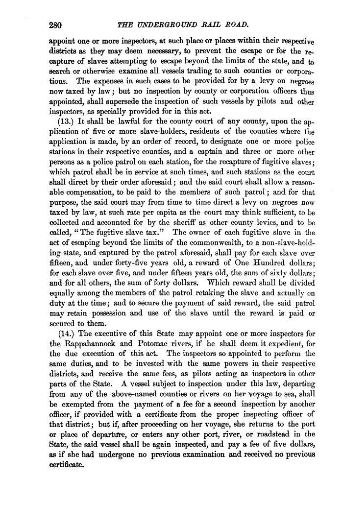 | 280 THE UNDERGROUND RAIL ROAD. appoint one or more inspectors, at such place or places within their respective districts as they may deem necessary, to prevent the escape or for the recapture of slaves attempting to escape beyond the limits of the state, and to search or otherwise examine all vessels trading to such counties or corporations. The expenses in such cases to be provided for by a levy on negroes now taxed by law; but no inspection by county or corporation officers thus appointed, shall supersede the inspection of such vessels by pilots and other inspectors, as specially provided for in this act. (13.) It shall be lawful for the county court of any county, upon the application of five or more slave-holders, residents of the counties where the application is made, by an order of record, to designate one or more police stations in their respective counties, and a captain and three or more other persons as a police patrol on each station, for the recapture of fugitive slaves; which patrol shall be in service at such times, and such stations as the court shall direct by their order aforesaid; and the said court shall allow a reasonable compensation, to be paid to the members of such patrol j and for that purpose, the said court may from time to time direct a levy on negroes now taxed by law, at such rate per capita as the court may think sufficient, to be collected and accounted for by the sheriff as other county levies, and to be called, " The fugitive slave tax." The owner of each fugitive slave in the act of escaping beyond the limits of the commonwealth, to a non-slave-holding state, and captured by the patrol aforesaid, shall pay for each slave over fifteen, aud under forty-five years old, a reward of One Hundred dollars; for each slave over five, and under fifteen years old, the sum of sixty dollars; and for all others, the sum of forty dollars. Which reward shall be divided equally among the members of the patrol retaking the slave and actually on duty at the time; and to secure the payment of said reward, the said patrol may retain possession and use of the slave until the reward is paid or secured to them. (14.) The executive of this State may appoint one or more inspectors for the Rappahannoek and Potomac rivers, if he shall deem it expedient, for the due execution of this act. The inspectors so appointed to perform the same duties, and to be invested with the same powers in their respective districts, and receive the same fees, as pilots acting as inspectors in other parts of the State. A vessel subject to inspection under this law, departing from any of the above-named counties or rivers on her voyage to sea, shall be exempted from the payment of a fee for a second inspection by another officer, if provided with a certificate from the proper inspecting officer of that district; but if, after proceeding on her voyage, she returns to the port or place of departtfte, or enters any other port, river, or roadstead in the State, the said vessel shall be again inspected, and pay a fee of five dollars, as if she had undergone no previous examination and received no previous certificate. |