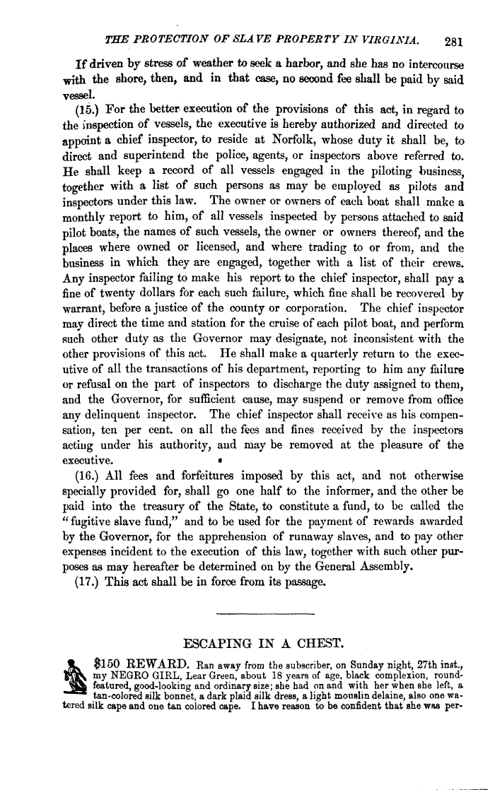 | THE PROTECTION OF SLA VE PROPERTY IN VIRGINIA. 281 If driven by stress of weather to seek a harbor, and she has no intercourse with the shore, then, and in that case, no second fee shall be paid by said vessel. (15.) For the better execution of the provisions of this act, in regard to the inspection of vessels, the executive is hereby authorized and directed to appoint a chief inspector, to reside at Norfolk, whose duty it shall be, to direct and superintend the police, agents, or inspectors above referred to. He shall keep a record of all vessels engaged in the piloting business, together with a list of such persons as may be employed as pilots and inspectors under this law. The owner or owners of each boat shall make a monthly report to him, of all vessels inspected by persons attached to said pilot boats, the names of such vessels, the owner or owners thereof, and the places where owned or licensed, and where trading to or from, and the business in which they are engaged, together with a list of their crews. Any inspector failing to make his report to the chief inspector, shall pay a fine of twenty dollars for each such failure, which fine shall be recovered by warrant, before a justice of the county or corporation. The chief inspector may direct the time and station for the cruise of each pilot boat, and perform such other duty as the Governor may designate, not inconsistent with the other provisions of this act. He shall make a quarterly return to the executive of all the transactions of his department, reporting to him any failure or refusal on the part of inspectors to discharge the duty assigned to them, and the Governor, for sufficient cause, may suspend or remove from office any delinquent inspector. The chief inspector shall receive as his compensation, ten per cent, on all the fees and fines received by the inspectors actiiig under his authority, aiid may be removed at the pleasure of the executive. « (16.) All fees and forfeitures imposed by this act, and not otherwise specially provided for, shall go one half to the informer, and the other be paid into the treasury of the State, to constitute a fund, to be called the " fugitive slave fund," and to be used for the payment of rewards awarded by the Governor, for the apprehension of runaway slaves, and to pay other expenses incident to the execution of this law, together with such other purposes as may hereafter be determined on by the General Assembly. (17.) This act shall be in force from its passage. ESCAPING IN A CHEST. $150 REWARD. Ran away from the subscriber, on Sunday night, 27th inst., my NEGRO GIRL, Lear Green, about 18 years of age, black complexion, round-featured, good-looking and ordinary size; she had on and with her when she left, a tan-colored silk bonnet, a dark plaid silk dress, a light mouslin delaine, also one watered silk cape and one tan colored cape. I have reason to be confident that she was per- |