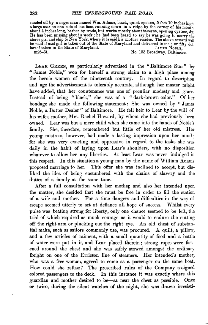 | 282 THE UNDERGROUND RAIL ROAD. snaded off by a negro man named Wm. Adams, black, quick spoken, 5 feet 10 inches high, a large scar on one side of his face, running down in a ridge by the corner of his mouth' about 4 inches long, barber by trade, but works mostly about taverns, opening oysters &c! He has been missing about a we«k ; he had been heard to say he was going to marry the above girl and ship to New York, where it is said his mother resides. The above reward will be paid if said girl is taken out of the State of Maryland and delivered to me ; or fifty dollars if taken in the State of Maryland. JAMES NOBLE, m26-3t. No. 153 Broadway, Baltimore. LEAK GREEN, so particularly advertised in the "Baltimore Sun" by " James Noble," won for herself a strong claim to a high place among the heroic women of the nineteenth century. In regard to description and age the advertisement is tolerably accurate, although her master might have added, that her countenance was one of peculiar modesty aud grace. Instead of being " black," she was of a " dark-brown color." Of her bondage she made the following statement: She was owned by " James Noble, a Butter Dealer " of Baltimore. He fell heir to Lear by the will of his wife's mother, Mrs. Rachel Howard, by whom she had previously been owned. Lear was but a mere child when she came into the hands of Noble's family. She, therefore, remembered but little of her old mistress. Her young mistress, however, had made a lasting impression upon her mind; for she was very exacting and oppressive in regard to the tasks she was daily in the habit of laying upon Lear's shoulders, with no disposition whatever to allow her any liberties. At least Lear was never indulged in this respect. In this situation a young man by the name of William Adams proposed marriage to her. This offer she was inclined to accept, but disliked the idea of being encumbered with the chains of slavery and the duties of a family at the same time. After a full consultation with her mothej and also her intended upon the matter, she decided that she must be free in order to fill the station of a wife and mother. For a time dangers and difficulties in the way of escape seemed utterly to set at defiance all hope of success. Whilst every pulse was beating strong for liberty, only one chance seemed to be left, the trial of which required as much courage as it would to endure the cutting off the right arm or plucking out the right eye. An old chest of substantial make, such as sailors commonly use, was procured. A quilt, a pillow, and a few articles of raiment, with a small quantity of food and a bottle of water were put in it, and Lear placed therein; strong ropes were fastened around the chest and she was safely stowed amongst the ordinary freight on one of the Erricson line of steamers. Her intended's mother, who was a free woman, agreed to come as a passenger on the same boat. How could she refuse? The prescribed rules of the Company assigned colored passengers to the deck. In this instance it was exactly where this guardian and mother desired to be—as near the chest as possible. Once or twice, during the silent watches of the night, she was drawn irresisti- |