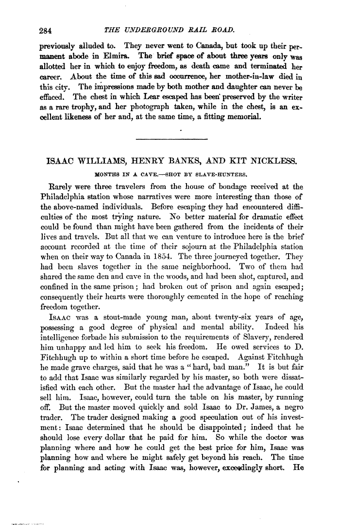 | 284 THE UNDERGROUND RAIL ROAD. previously alluded to. They never went to Canada, but took up their permanent abode in Elmira. The brief space of about three years only was allotted her in which to enjoy freedom, as death came and terminated her career. About the time of this sad occurrence, her mother-in-law died in this city. The impressions made by both mother and daughter can never be effaced. The chest in which Lear escaped has been preserved by the writer as a rare trophy, and her photograph taken, while in the chest, is an ex-oellent likeness of her and, at the same time, a fitting memorial. ISAAC WILLIAMS, HENEY BANKS, AND KIT NICKLESS. MONTHS IN A CAVE.—SHOT BY 8LAVE-HUNTEKS. Rarely were three travelers from the house of bondage received at the Philadelphia station whose narratives were more interesting than those of the above-named individuals. Before escaping they had encountered difficulties of the most trying nature. No better material for dramatic effect could be found than might have been gathered from the incidents of their lives and travels. But all that we can venture to introduce here is the brief account recorded at the time of their sojourn at the Philadelphia station when on their way to Canada in 1854. The three journeyed together. They had been slaves together in the same neighborhood. Two of them had shared the same den and cave in the woods, and had been shot, captured, and confined in the same prison; had broken out of prison and again escaped; consequently their hearts were thoroughly cemented in the hope of reaching freedom together. ISAAC was a stout-made young man, about twenty-six years of age, possessing a good degree of physical and mental ability. Indeed his intelligence forbade his submission to the requirements of Slavery, rendered him unhappy and led him to seek his freedom. He owed services to D. Fitchhugh up to within a short time before he escaped. Against Fitchhugh he made grave charges, said that ho was a " hard, bad man." It is but fair to add that Isaac was similarly regarded by his master, so both were dissatisfied with each other. But the master had the advantage of Isaac, he could sell him. Isaac, however, could turn the table on his master, by running off. But the master moved quickly and sold Isaac to Dr. James, a negro trader. The trader designed making a good speculation out of his investment: Isaac determined that he should be disappointed; indeed that he should lose every dollar that he paid for him. So while the doctor was planning where and how he could get the best price for him, Isaac was planning how and where he might safely get beyond his reach. The time for planning and acting with Isaac was, however, exceedingly short. He |