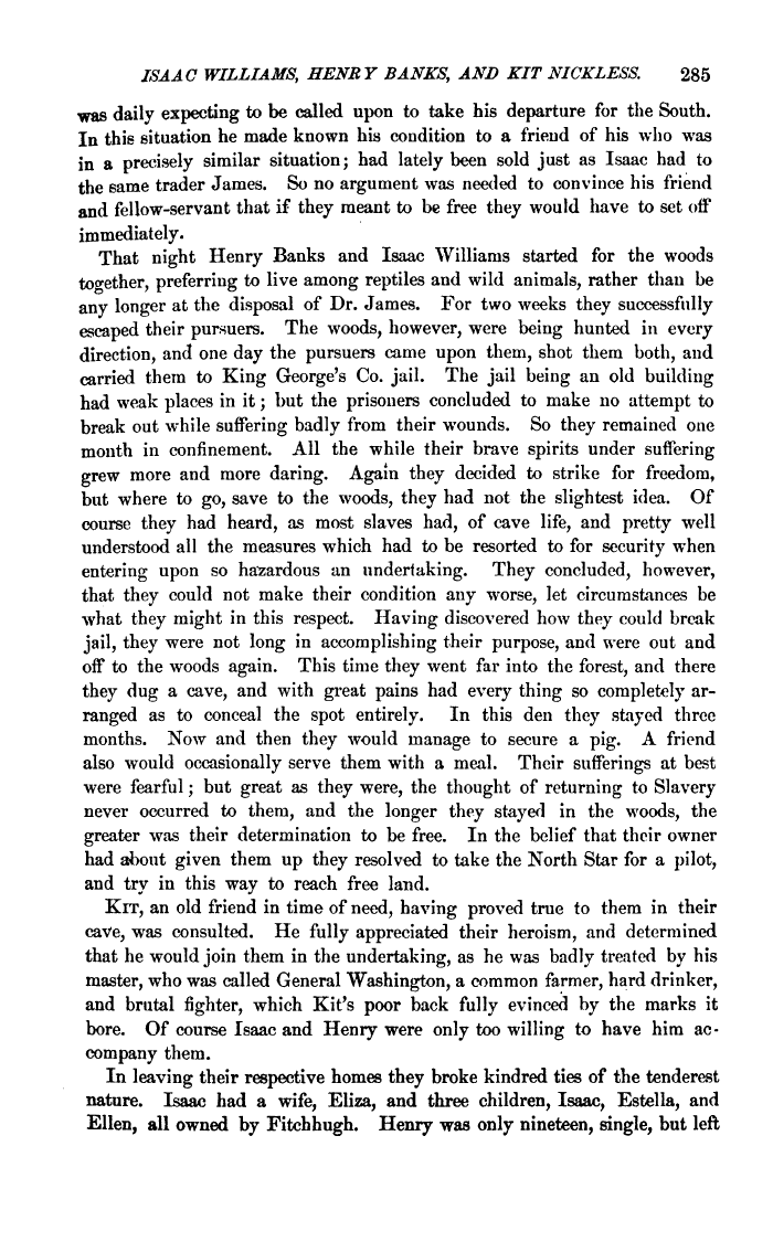 | ISAAC WILLIAMS, HENRY BANKS, AND KIT NICKLESS. 285 was daily expecting to be called upon to take his departure for the South. In this situation he made known his condition to a frieud of his who was in a precisely similar situation; had lately been sold just as Isaac had to the same trader James. So no argument was needed to convince his friend and fellow-servant that if they meant to be free they would have to set off immediately. That night Henry Banks and Isaac Williams started for the woods together, preferring to live among reptiles and wild animals, rather than be any longer at the disposal of Dr. James. For two weeks they successfully escaped their pursuers. The woods, however, were being hunted in every direction, and one day the pursuers came upon them, shot them both, and carried them to King George's Co. jail. The jail being an old building had weak places in it; but the prisoners concluded to make no attempt to break out while suffering badly from their wounds. So they remained one month in confinement. All the while their brave spirits under suffering grew more and more daring. Again they decided to strike for freedom, but where to go, save to the woods, they had not the slightest idea. Of course they had heard, as most slaves had, of cave life, and pretty well understood all the measures which had to be resorted to for security when entering upon so hazardous an undertaking. They concluded, however, that they could not make their condition any worse, let circumstances be what they might in this respect. Having discovered how they could break jail, they were not long in accomplishing their purpose, and were out and off to the woods again. This time they went far into the forest, and there they dug a cave, and with great pains had every thing so completely arranged as to conceal the spot entirely. In this den they stayed three months. Now and then they would manage to secure a pig. A friend also would occasionally serve them with a meal. Their sufferings at best were fearful; but great as they were, the thought of returning to Slavery never occurred to them, and the longer they stayed in the woods, the greater was their determination to be free. In the belief that their owner had about given them up they resolved to take the North Star for a pilot, and try in this way to reach free land. KIT, an old friend in time of need, having proved true to them in their cave, was consulted. He fully appreciated their heroism, and determined that he would join them in the undertaking, as he was badly treated by his master, who was called General Washington, a common farmer, hard drinker, and brutal fighter, which Kit's poor back fully evinced by the marks it bore. Of course Isaac and Henry were only too willing to have him accompany them. In leaving their respective homes they broke kindred ties of the tenderest nature. Isaac had a wife, Eliza, and three children, Isaac, Estella, and Ellen, all owned by Fitchhugh. Henry was only nineteen, single, but left |