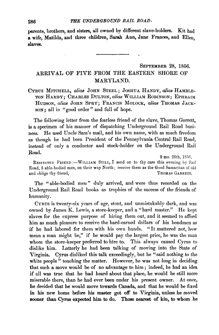 | 286 ZZTtf UNDERGROUND RAIL ROAD. parents, brothers, and sisters, all owned by different slave-holders. Kit had a wife, Matilda, and three children, Sarah Ann, Jane Frances, and Ellen, slaves. SEPTEMBER 28, 1866. ARRIVAL OF FIVE FROM THE EASTERN SHORE OF MARYLAND. CYRUS MITCHELL, alias JOHN STEEL ; JOSHUA HANDY, alias HAMBLE-TON HAMBY; CHAELES DULTON, alias WILLIAM ROBINSON; EPHRAIM HUDSON, alias JOHN SPRY; FRANCIS MOLOCK, alias THOMAS JACKSON; all in "good order" and full of hope. The following letter from the fearless friend of the slave, Thomas Garrett, is a specimen of his manner of dispatching Underground Rail Road business. He used Uncle Sam's mail, and his own name, with as much freedom as though lie had been President of the Pennsylvania Central Rail Road, instead of only a conductor and stock-holder on the Underground Rail Road. 9 mo. 26th, 1856. RESPECTED FRIEND :—WILLIAM STILL, I send on to thy care this evening by Rail Road, 5 able-bodied men, on their way North; receive them as the Good Samaritan of old and oblige thy friend, THOMAS GARRETT. The "able-bodied men" duly arrived, and were thus recorded on the Underground Rail Road books as trophies of the success of the friends of humanity. CYRUS is twenty-six years of age, stout, and unmistakably dark, and was owned by James K. Lewis, a store-keeper, and a "hard master." He kept slaves for the express purpose of hiring them out, and it seemed to afford him as much pleasure to receive the hard-earned dollars of his bondmen as if he had labored for them with his own hands. " It mattered not, how mean a man might be," if he would pay the largest price, he was the man whom the store-keeper preferred to hire to. This always caused Cyrus to dislike him. Latterly he had been talking of moving into the State of Virginia. Cyrus disliked this talk exceedingly, but he "said nothing to the •white people " touching the matter. However, he was not long in deciding that such a move would be of no advantage to him; indeed, he had an idea if all was true that he had heard about that place, he would be still more miserable there, than he had ever been under his present owner. At once, he decided that he would move towards Canada, and that he would be fixed in his new home before his master got off to Virginia, unless he moved sooner than Cyrus expected him to do. Those nearest of kin, to whom he |