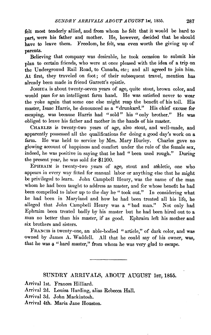 | SUNDR Y ARRIVALS ABOUT AUOUST lit, 1855. 287 felt most tenderly allied, aud from whom he felt that it would be hard to part, were his father and mother. He, however, decided that he should have to leave them. Freedom, he felt, was even worth the giving up of parents. Believing that company was desirable, he took occasion to submit his plan to certain friends, who were at once pleased with the idea of a trip on the Underground Rail Road, to Canada, etc; and all agreed to join him. At first, they traveled on foot; of their subsequent travel, mention has already been made in friend Garrett's epistle. JOSHUA is about twenty-seven years of age, quite stout, brown color, and would pass for an intelligent farm hand. He was satisfied never to wear the yoke again that some one else might reap the benefit of his toil. His master, Isaac Harris, he denounced as a "drunkard." His chief excuse for escaping, was because Harris had "sold" his "only brother." He was obliged to leave his father and mother in the hands of his master. CHARLES is twenty-two years of age, also stout, and well-made, and apparently possessed all the qualifications for doing a good day's work on a farm. He was held to service by Mrs. Mary Hurley. Charles gave no glowing account of happiness and comfort under the rale of the female sex, indeed, he was positive in saying that lie had " been used rough." During the present year, he was sold for $1200. EPHKAIM is twenty-two years of age, stout and athletic, one who appears in every way fitted for manual labor or anything else that he might be privileged to learn. John Campbell Henry, was the name of the man whom he had been taught to address as master, and for whose benefit he had been compelled to labor up to the day he " took out." In considering what he had been in Maryland and how he had been treated all his life, he alleged that John Campbell Henry was a "bad man." Not only had Ephraim been treated badly by his master but he had been hired out to a man no better than his master, if as good. Ephraim left his mother and six brothers and sisters. FRANCIS is twenty-one, an able-bodied " article," of dark color, and was owned by James A. Waddell. All that he could say of his owner, was, that he was 3 " hard master," from whom he was very glad to escape. SUNDRY ARRIVALS, ABOUT AUGUST IST, 1855. Arrival 1st. Frances Billiard. Arrival 2d. Louisa Harding, alias Rebecca Hall. Arrival 3d. John Mackintosh. Arrival 4th. Maria Jane Houston. |
