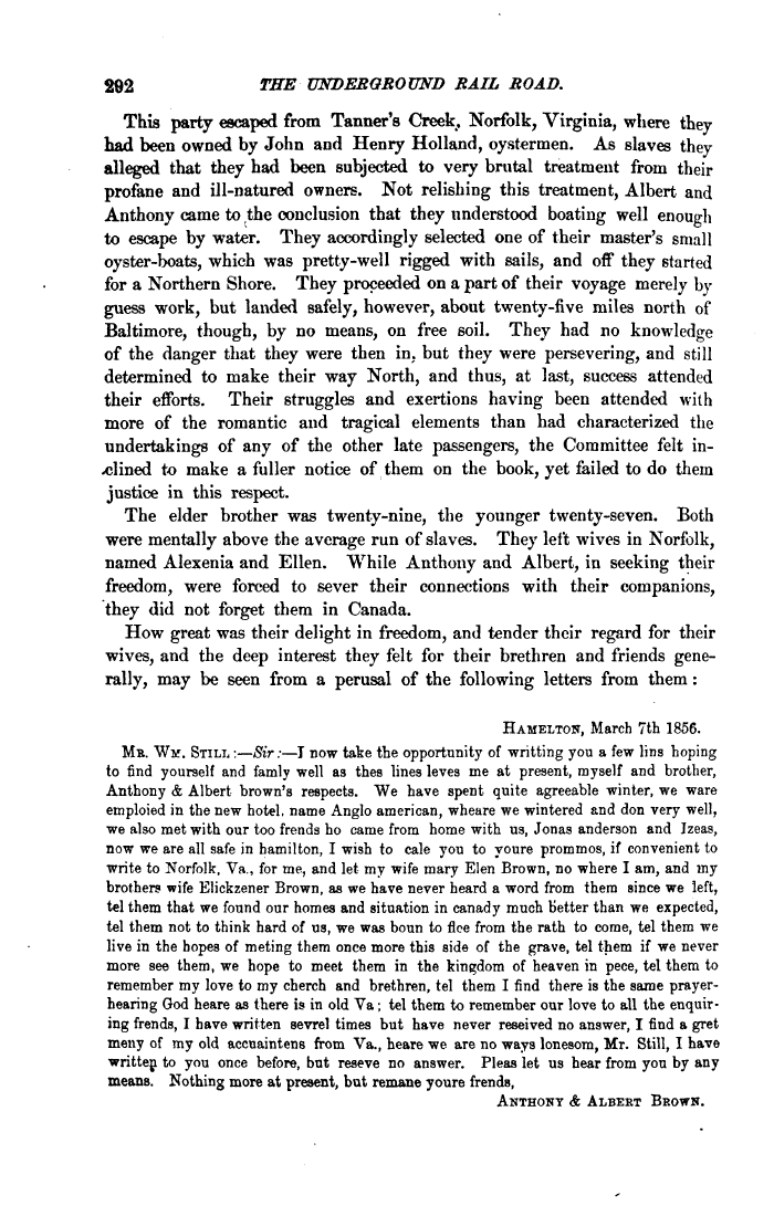 | 292 THE UNDERGROUND RAIL ROAD. This party escaped from Tanner's Creek, Norfolk, Virginia, where they had been owned by John and Henry Holland, oystermen. As slaves they alleged that they had been subjected to very brutal treatment from their profkne and ill-natured owners. Not relishing this treatment, Albert and Anthony came to the conclusion that they understood boating well enough to escape by water. They accordingly selected one of their master's small oyster-boats, which was pretty-well rigged with sails, and off they started for a Northern Shore. They proceeded on a part of their voyage merely by guess work, but landed safely, however, about twenty-five miles north of Baltimore, though, by no means, on free soil. They had no knowledge of the danger that they were then in. but they were persevering, and still determined to make their way North, and thus, at last, success attended their efforts. Their struggles and exertions having been attended with more of the romantic and tragical elements than had characterized the undertakings of any of the other late passengers, the Committee felt in-xjlined to make a fuller notice of them on the book, yet failed to do them justice in this respect. The elder brother was twenty-nine, the younger twenty-seven. Both were mentally above the average run of slaves. They left wives in Norfolk, named Alexenia and Ellen. While Anthony and Albert, in seeking their freedom, were forced to sever their connections with their companions, they did not forget them in Canada. How great was their delight in freedom, and tender their regard for their wives, and the deep interest they felt for their brethren and friends generally, may be seen from a perusal of the following letters from them: HAMELTOTT, March 7th 1856. MB. WM. STILL -.—Sir:—I now take the opportunity of writting you a few lins hoping to find yourself and famly well as thes lines leves me at present, myself and brother, Anthony & Albert brown's respects. We have spent quite agreeable winter, we ware emploied in the new hotel, name Anglo american, wheare we wintered and don very well, we also met with our too frends ho came from home with us, Jonas anderson and Jzeas, now we are all safe in hamilton, I wish to cale you to youre prommos, if convenient to write to Norfolk, Va., for me, and let my wife mary Elen Brown, no where I am, and my brothers wife Elickzener Brown, as we have never heard a word from them since we left, tel them that we found our homes and situation in canady much better than we expected, tel them not to think hard of us, we was boun to flee from the rath to come, tel them we live in the hopes of meting them once more this side of the grave, tel them if we never more see them, we hope to meet them in the kingdom of heaven in pece, tel them to remember my love to my cherch and brethren, tel them I find there is the same prayer-hearing God heare as there is in old Va; tel them to remember our love to all the enquiring frends, I have written sevrel times but have never reseived no answer, I find a gret meny of my old accoaintens from Va., heare we are no ways lonesom, Mr. Still, I have written to you once before, bat reseve no answer. Pleas let us hear from you by any means. Nothing more at present, but remane youre frends, ANTHONY & ALBERT BROWN. |