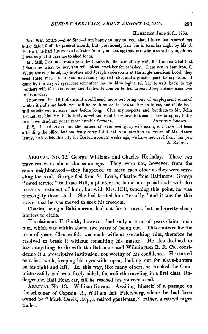 | sundRY ARRIVALS, ABOUT AuoUST itt, 1355. 293 HAMILTON June 26th, 1856. Ma. WM. STILL:—Jdne Sir:—I am happy to say to you that I have jus reseved my letter dated 5 of the present month, but previeously had bin in form las night by Mr. J. H. Hall, he had jus reseved a letter from you stating that my wife was with you, oh my I was so glad it case me to shed tears. Mr. Still, I cannot return you the thanks for the care of my wife, for I am so Glad that I dont now what to say, you will pleas start her for canaday. I am yet in hamilton, C. W, at the city hotel, my brother and Joseph anderson is at the angle american hotel, they send there respects to you and family my self also, and a greater part to my wife. I came by the way of syracruse remember me to Mrs. logins, tel her to writ back to my brothers wife if she is living and tel her to com on tel her to send Joseph Andersons love to his mother. i now send her 10 Dollers and would send more but being out of employment some of winter it pulls me back, you will be so kine as to forward her on to me, and if life las I will satisfie you at some time, before long. Give my respects and brothers to Mr. John Dennes, tel him Mr. Hills famly is wel and send there love to them, I now bring ray letter to a close, And am youre most humble Servant, ANTHONY BROWN. P. S. I had given out the notion of ever seeing my wife again, so I have not been attending the office, but am truly sorry I did not, you mention in yours of Mr. Henry lewey, he has left this city for Boston about 2 weeks ago, we have not herd from him yet. A. BROWN. ARRIVAL No. 12. George Williams and Charles Holladay. These two travelers were about the same age. They were not, however, from the same neighborhood—they happened to meet each other as they were traveling the road. George fled from St. Louis, Charles from Baltimore. George "owed service" to Isaac Hill, a planter; he found no special fault with his master's treatment of him ; but with Mrs. Hill, touching this point, he was thoroughly dissatisfied. She had treated him "cruelly," and it was for this reason that he was moved to seek his freedom. Charles, being a Baltimorean, had not far to travel, but had pretty sharp hunters to elude. His claimant, Y. Smith, however, had only a term of years claim upon him, which was within about two years of being out. This contract for the terra of years, Charles felt was made without consulting him, therefore he resolved to break it without consulting his master. He also declined to have anything to do with the Baltimore and Wilraington R. R. Co., considering it a prescriptive institution, not worthy of his confidence. He started on a fast walk, keeping his eyes wide open, looking out for slave-hunters on his right and left. In this way, like many others, he reached the Committee safely and was freely aided, thenceforth traveling in a first class Underground Rail Road car, till he reached his journey's end. ARRIVAL No. 13. William Govan. Availing himself of a passage on the schooner of Captain B., William left Petersburg, where he had been owned by " Mark Davis, Esq., a retired gentleman," rather, a retired negro trader. |