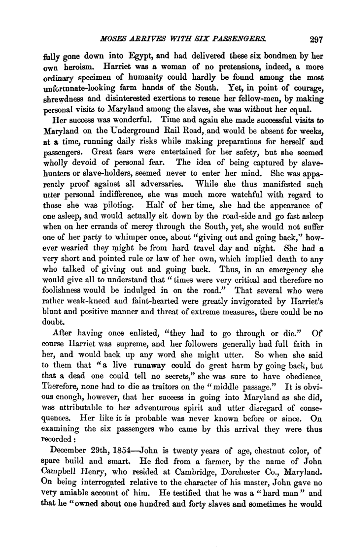 | MOSES ARRIVES WITH SIX PASSENGERS. 297 folly gone down into Egypt, and had delivered these six bondmen by her own heroism. Harriet was a woman of no pretensions, indeed, a more ordinary specimen of humanity could hardly be found among the most unfortunate-looking farm hands of the South. Yet, in point of courage, shrewdness &nd disinterested exertions to rescue her fellow-men, by making personal visits to Maryland among the slaves, she was without her equal. Her success was wonderful. Time and again she made successful visits to Maryland on the Underground Rail Road, and would be absent for weeks, at a time, running daily risks while making preparations for herself and passengers. Great fears were entertained for her safety, but she seemed wholly devoid of personal fear. The idea of being captured by slave-hunters or slave-holders, seemed never to enter her mind. She was apparently proof against all adversaries. While she thus manifested such utter personal indifference, she was much more watchful with regard to those she was piloting. Half of her time, she had the appearance of one asleep, and would actually sit down by the road-side and go fast asleep when on her errands of mercy through the South, yet, she would not suffer one of her party to whimper once, about "giving out and going back," however wearied they inight be from hard travel day and night. She had a very short and pointed rule or law of her own, which implied death to any who talked of giving out and going back. Thus, in an emergency she would give all to understand that " times were very critical and therefore no foolishness would be indulged in on the road." That several who were rather weak-kneed and faint-hearted were greatly invigorated by Harriet's blunt and positive manner and threat of extreme measures, there could be no doubt. After having once enlisted, "they had to go through or die." Of course Harriet was supreme, and her followers generally had full faith in her, and would back up any word she might utter. So when she said to them that " a live runaway could do great harm by going back, but that a dead one could tell no secrets," she was sure to have obedience. Therefore, none had to die as traitors on the " middle passage." It is obvious enough, however, that her success in going into Maryland as she did, was attributable to her adventurous spirit and utter disregard of consequences. Her like it is probable was never known before or since. On examining the six passengers who came by this arrival they were thus recorded: December 29th, 1854—John is twenty years of age, chestnut color, of spare build and smart. He fled from a farmer, by the name of John Campbell Henry, who resided at Cambridge, Dorchester Co., Maryland. On being interrogated relative to the character of his master, John gave no very amiable account of him. He testified that he was a " hard man " and that he "owned about one hundred and forty slaves and sometimes he would |