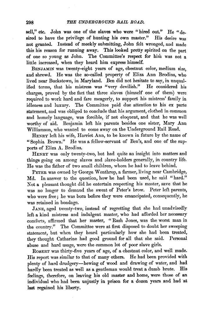 | 298 THE UNDERGEOUND HAIL ROAD. sell," etc. John was one of the slaves who were " hired out." He " desired to have the privilege of hunting his own master." His desire was not granted. Instead of meekly submitting, John felt wronged, and made this his reason for running away. This looked pretty spirited on the part of one so young as John. The Committee's respect for him was not a little increased, when they heard him express himself. BENJAMIN was twenty-eight years of age, chestnut color, medium size, and shrewd. He was the so-called property of Eliza Ann Brodins, who lived near Buckstown, in Maryland. Ben did not hesitate to say, in unqualified terms, that his mistress was "very devilish." He considered his charges, proved by the fact that three slaves (himself one of them) were required to work hard and fare meagerly, to support his mistress' family in idleness and luxury. The Committee paid due attention to his ex parte statement, and was obliged to conclude that his argument, clothed in common and homely language, was forcible, if not eloquent, and that he was well worthy of aid. Benjamin left his parents besides one sister, Mary Ann Williamson, who wanted to come away on the Underground Rail Road. HEXRY left his wife, Harriet Ann, to be known in future by the name of " Sophia Brown." He was a fellow-servant of Ben's, and one of the supports of Eliza A. Brodins. HENRY was only twenty-two, but had quite an insight into matters and things going on among slaves and slave-holders generally, in country life. He was the father of two small children, whom he had to leave behind. PETER was owned by George Wenthrop, a farmer, living near Cambridge, Md. In answer to the question, how he had been used, he said " hard." Not a pleasant thought did he entertain respecting his master, save that he was no longer to demand the sweat of Peter's brow. Peter left parents, who were free; he was born before they were emancipated, consequently, he was retained in bondage. JANE, aged twenty-two, instead of regretting that she had unadvisedly left a kind mistress and indulgent master, who had afforded her necessary comforts, affirmed that her master, " Rash Jones, was the worst man in the country." The Committee were at first disposed to doubt her sweeping statement, but when they heard particularly how she had been treated, they thought Catharine had good ground for all that she said. Personal abuse and hard usage, were the common lot of poor slave girls. ROBERT was thirty-five years of age, of a chestnut color, and well made. His report was similar to that of many others. He had been provided with plenty of hard drudgery—hewing of wood and drawing of water, and had hardly been treated as well as a gentleman would treat a dumb brute. His feelings, therefore, on leaving his old master and home, were those of an individual who had been unjustly in prison for a dozen years and had at last regained his liberty. |
