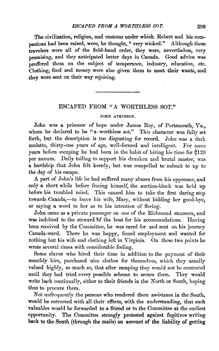 | ESCAPED FROM A WORTHLESS SOT. 299 The civilization, religion, and customs under which Robert and his companions had been raised, were, he thought, " very wicked/' Although these travelers were all of the field-hand order, they were, nevertheless, very promising, and they anticipated better days in Canada. Good advice was proffered them on the subject of temperance, industry, education, etc. Clothing, food and money were also given them to meet their wants, and they were sent on their way rejoicing. ESCAPED FROM «A WORTHLESS SOT." JOHN ATKINSON. John was a prisoner of hope under James Ray, of Portsmouth, Va., whom he declared to be " a • worthless sot." This character was fully set forth, but the description is too disgusting for record. John was a dark mulatto, thirty-one years of age, well-formed and intelligent. For some years before escaping he had been in the habit of hiring his time for $120 per annum. Daily toiling to support his drunken and brutal master, was a hardship that John felt keenly, but was compelled to submit to up to the day of his escape. A part of John's life lie had suffered many abuses from his oppressor, and only a short while before freeing himself, the auction-block was held up before his troubled mind. This caused him to take the first daring step towards Canada,—to leave his wife, Mary, without bidding her good-bye, or saying a word to her as to his intention of fleeing. John came as a private passenger on one of the Richmond steamers, and was indebted to the steward bf the boat for his accommodations. Having been received by the Committee, he was cared for and sent on his journey Canada-ward. There he was happy, found employment and wanted for nothing but his wife and clothing left in Virginia. On these two points he wrote several times with considerable feeling. Some slaves who hired their time in addition to the payment of their monthly hire, purchased nice clothes for themselves, which they usually valued highly, so much so, that after escaping they would not be contented until they had tried every possible scheme to secure them. They would write back continually, either to their friends in the North or South, hoping thus to procure them. Not unfrcquently the persons who rendered them assistance in the South, would be entrusted with all their effects, with the understanding, that such valuables would be forwarded to a friend or to the Committee at the earliest opportunity. The Committee strongly protested against fugitives writing back to the South (through the mails) on account of the liability of getting |