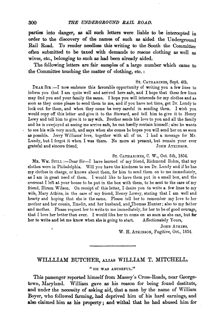 | 300 THE UNDERGROUND RAIL ROAD. parties into danger, as all such letters were liable to be intercepted in order to the discovery of the names of such as aided the Underground Rail Road. To render needless this writing to the South the Committee often submitted to be taxed with demands to rescue clothing as well as wives, etc., belonging to such as had been already aided. The following letters are fair samples of a large number which came to the Committee touching the matter of clothing, etc.: ST. CATHARINES, Sept. 4th. DEAE SIB :—I now embrace this favorable opportunity of writing you a few lines to inform you that I am quite well and arrived here safe, and I hope that these few lines may find you and your family the same. I hope you will intercede for my clothes and as soon as they come please to send them to me, and if you have not time, get Dr. Lundy to look out for them, and when they come be very careful in sending them. I wish you would copy off this letter and give it to the Steward, and tell him to give it to Henry Lewy and tell him to give it to my wife. Brother sends his love to you and all the family and he is overjoyed at seeing me arrive safe, he can harrdly contain himself; also he wants to see his wife very much, and says when she comes he hopes you will send her on as soon as possible. Jerry Williams' love, together with all of us. I had a message for Mr. Lundy, but I forgot it when I was there. No more at present, but remain your ever grateful and sincere friend, JOHN ATKINSON. ST. CATHARINES, C. W., Oct. 5th, 1854 ME. WM. STILL :—Dear Sir—I have learned of my friend, Richmond Bohm, that my clothes were in Philadelphia. Will you have the kindness to see Dr. Lundy and if he has my clothes in charge, or knows about them, for him to send them on to me immediately, as I am in great need of them. I would like to have them put in a small box, and the overcoat I left at your house to be put in the box with them, to be sent to the care of my friend, Hiram Wilson. On receipt of this letter, I desire you to write a few lines to my wife, Mary Atkins, in the care of my friend, Henry Lowey, stating that I am well and hearty and hoping that she is the same. Please tell her to remember my love to her mother and her cousin, Emelin, and her husband, andJThomas Hunter; also to my father and mother. Please request her to write to me immediately, for her to be of good courage, that I love her better than ever. I would like her to come on as soon as she can, but for her to write and let me know when she is going to start. Affectionately Yours, JOHN ATKINS. W. H. ATKINSON, Fugitive, Oct., 1854. This passenger reported himself from Massey's Cross-Roads, near Georgetown, Maryland. William gave as his reason for being found destitute, and under the necessity of asking aid, that a man by the name of William Boyer, who followed farming, had deprived him of his hard earnings, and also claimed him as his property; and withal that he had abused him for |