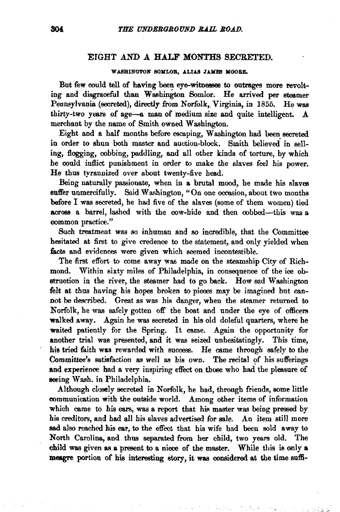 | 804 TSE UNDERGROUND SAIL SOAD. EIGHT AND A HALF MONTHS SECRETED. WASHINGTON 8OMLOR, ALIAS JAMB8 HOOBE. But few could tell of having been eye-witnesses to outrages more revolting and disgraceful than Washington Somlor. He arrived per steamer Pennsylvania (secreted), directly from Norfolk,. Virginia, in 1855. He was thirty-two years of age—a man of medium size and quite intelligent. A merchant by the name of Smith owned Washington. Eight and a half months before escaping, Washington had been secreted in order to shun both master and auction-block. Smith believed in selling, flogging, cobbing, paddling, and all other kinds of torture, by •which he could inflict punishment in order to make the slaves feel his power. He thus tyrannized over about twenty-five head. Being naturally passionate, when in a brutal mood, he made his slaves suffer unmercifully. Said Washington, "On one occasion, about two months before I was secreted, he had five of the slaves (some of them women) tied across a barrel, lashed with the cow-hide and then cobbed—this was a common practice." Such treatment was so inhuman and so incredible, that the Committee hesitated at first to give credence to the statement, and only yielded when facts and evidences were given 'which seemed incontestable. The first effort to come away was made on the steamship City of Richmond. Within sixty miles of Philadelphia, in consequence of the ice obstruction in the river, the steamer had to go back. How sad Washington felt at thus having his hopes broken to pieces may be imagined but cannot be described. Great as was his danger, when the steamer returned to Norfolk, he was safely gotten off the boat and under the eye of officers walked away. Again he was secreted in his old doleful quarters, where he waited patiently for the Spring. It came. Again the opportunity for another trial was presented, and it was seized unhesitatingly. This time, his tried faith was rewarded with success. He came through safely to the Committee's satisfaction as well as bis own. The recital 9f his sufferings and experience had a very inspiring effect on tboee who had the pleasure of seeing Wash, in Philadelphia. Although closely secreted in Norfolk, he had, through friends, some little communication with the outside world. Among other items of information •which came to his ears, was a report that hift master vras being pressed by his creditors, and had all his slaves advertised for sale. An item still more sad also reached his ear, to the effect that his wife had been sold away to North Carolina, and thns separated from her child, two years old. The child was given as a present to a niece of the master. While this is only a meagre portion of his interesting story, it was considered at the time suffi- |