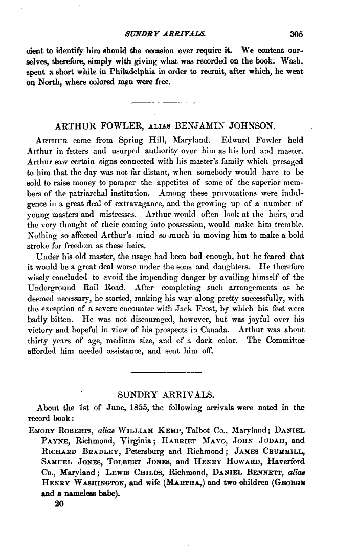 | SUNDRY ARRIVALS. 306 cient to identify him should the occasion ever require it We content ourselves, therefore, simply with giving what was recorded on the book. Wash, spent a short while in Philadelphia in order to recruit, after which, he went on North, where colored mpn were free. ARTHUR FOWLER, ALIAS BENJAMIN JOHNSON. ARTHUR came from Spring Hill, Maryland. Edward Fowler held Arthur in fetters and usurped authority over him as his lord and master. Arthur saw certain signs connected with his master's family which presaged to him that the day was not far distant, -when somebody would have to be sold to raise money to pamper the appetites of some of the superior members of the patriarchal institution. Among these provocations were indulgence in a great deal of extravagance, and the growing up of a number of young masters and mistresses. Arthur would often look at the heirs, and the very thought of their coming into possession, would make him tremble. Nothing so affected Arthur's mind so much in moving him to make a bold stroke for freedom as these heirs. Under his old master, the usage had been bad enough, but he feared that it would be a great deal worse under the sons and daughters. lie therefore wisely concluded to avoid the impending danger by availing himself of the Underground Rail Road. After completing such arrangements as he deemed necessary, ho started, making his way along pretty successfully, with the exception of a severe encounter with Jack Frost, by which his feet were badly bitten. Ho was not discouraged, however, but was joyful over his victory and hopeful in view of his prospects in Canada. Arthur was ahout thirty years of age, medium size, and of a dark color. The Committee afforded him needed assistance, and sent him off. SUNDRY ARRIVALS. About the 1st of June, 1855, the following arrivals were noted in the record book: EMORY ROBERTS, alias WILLIAM KEMP, Talbot Co., Maryland; DANIEL PAYNE, Richmond, Virginia; HARRIET MAYO, JOHN JUDAH, and RICHABD BRADLEY, Petersburg and Richmond; JAMES CBUMMILL, SAMUEL JONES, TOLBEBT JONES, and HENRY HOWARD, Haverford Co., Maryland; LEWIS CHIMIS, Richmond, DANIEL BEHNETT, alia* HEXEY WASHINGTON, and wife (MABTHA.,) and two children (GEORGE and a nameless babe). 20 |