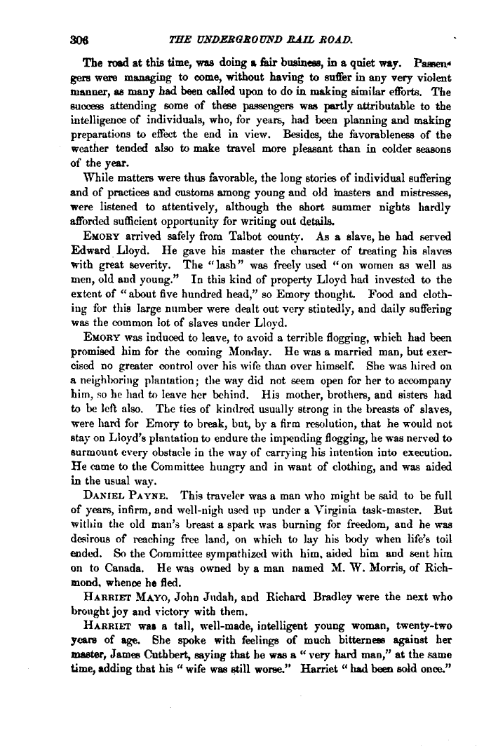 | 306 THE UNDERGROUND RAIL ROAD. The road at this time, was doing a fair business, in a quiet way. Paasen* gere were managing to come, without having to safer in any very violent manner, as many bad been called upon to do in making similar efforts. The success attending some of these passengers was partly attributable to the intelligence of individuals, who, for years, had been planning and making preparations to effect the end in view. Besides, the favorableness of the weather tended also to make travel more pleasant than in colder seasons of the year. While matters were thus favorable, the long stories of individual suffering and of practices and customs among young and old masters and mistresses, were listened to attentively, although the short summer nights hardly afforded sufficient opportunity for writing out details. EMORY arrived safely from Talbot county. As a slave, he had served Edward Lloyd. He gave his master the character of treating his slaves with great severity. The " lash" was freely used " on women as well as men, old and young." In this kind of property Lloyd had invested to the extent of " about five hundred head," so Emory thought Food and clothing for this large number were dealt out very stintedly, and daily suffering was the common lot of slaves under Lloyd. EMORY was induced to leave, to avoid a terrible flogging, which had been promised him for the coming Monday. He was a married man, but exercised no greater control over his wife than over himself. She was hired on a neighl>oring plantation; the way did not seem open for her to accompany him, so he had to leave her behind. His mother, brothers, and sisters had to be left also. The ties of kindred usually strong in the breasts of slaves, •were hard for Emory to break, but, by a firm resolution, that he would not stay on Lloyd's plantation to endure the impending flogging, he was nerved to surmount every obstacle in the way of carrying his intention into execution. He came to the Committee hungry and in want of clothing, and was aided in the usual way. DANIEL PAYNE. This traveler was a man who might be said to be full of years, infirm, and well-nigh used up under a Virginia task-master. But within the old man's breast a spark was burning for freedom, and he was desirous of reaching free land, on which to lay his body when life's toil ended. So the Committee sympathized with him, aided him and sent him. on to Canada. He was owned by a man named M. W. Morris, of Richmond, whence he fled. HARRIET MAYO, John Judah, and Richard Bradley were the next who brought joy and victory with them. HARRIET was a tall, well-made, intelligent young woman, twenty-two years of age. She spoke with feelings of mach bitterness against her master, James Cntbbert, saying that be was a " very hard man," at the same time, adding that his " wife was still worse." Harriet " had been sold once." |