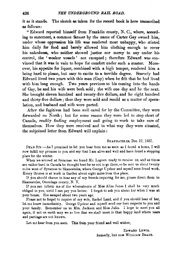 | 426 THE UNDERGROUND RAIL ROAD. it as it stands. The sketch as taken for the record book is here transcribed as follows: " Edward reported himself from Franklin county, N. C., where, according to statement, a common ikniier by the name of Carter Cray owned him, under whose oppression his life was rendered most unhappy, who stinted him daily for food and barely allowed him clothing enough to cover his nakedness, who neither showed justice nor mercy to any under his control, the ' weaker vessels' not excepted; therefore Edward was convinced that it was in vain to hope for comfort under such a master. Moreover, his appetite for liquor, combiDed with a high temper, rendered him a being hard to please, but easy to excite to a terrible degree. Scarcely had Edward lived two years with this man (Gay) when he felt that he had lived with him long enough. Two years previous to Lis coming into the hands of Gay, he and his wife were both sold; the wife one day and he the next. She brought eleven hundred and twenty-five dollars, and he eight hundred and thirty-five dollars; thus they were sold and resold as a matter of speculation, and husband and wife were parted. After the fugitives had been well cared for by the Committee, they were forwarded on North ; but for some reason they were led to stop short of Canada, readily finding employment and going to work to take care of themselves. How they were received and in what way they were situated, the subjoined letter from Edward will explain: SKAKEATEI.ES, Dec. 17, 1S57. DEAR Sra:—As I promised to let you hear from me as soon as I found a home, I will now fulfill ray promise to you and say that I am alive and well and have found a stopping place for the winter. When we arrived at Syracuse we found Mr. Loguen ready to receive us, and as times are rather bard in Canada he thought best for as not to go there, so he sent us about twenty miles west of Syracuse to Skaneateles, where George L'pshur and myself soon found work. Henry Grimes is at work in Garden about eight miles from this place. If ^ou should chance to hear any of my frienda inquiring for me, please direct them to Skaneatelea, Onondaga county, N. Y. If you can inform me of the whereabouts of Miss Alice Jones I shall be very much obliged to you, until I can pay yon better. I forgot to ask you about her when 1 was at your house. She escaped about two years ago. Pleaae not to forget to inquire of my wife, Rachel Land, and if you should hear of her, let me know immediately. George Upshur and myself send our best respects to you and your family. Remember us to Mrs. Jackson and Miss Julia. I hope to meet you all again, if not on earth may we so live that we shall meet in that happy land where tears and partiqgs axe not known. Let me bear from you soon. This from your friend and well wisher, EDWARD LEWIS, formerly, but now WILLIAM BRADT. |