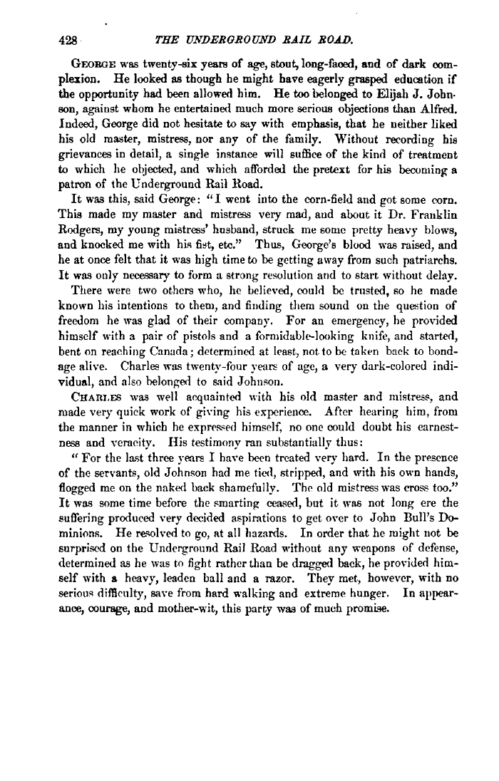 | 428 THE UNDERGROUND RAIL ROAD. GEOBGE was twenty-six years of age, stout, long-faced, and of dark complexion. He looked as though he might have eagerly grasped education if the opportunity had been allowed him. He too belonged to Elijah J. Johnson, against whom he entertained much more serious objections than Alfred. Indeed, George did not hesitate to say with emphasis, that he neither liked his old master, mistress, nor any of the family. Without recording his grievances in detail, a single instance will suffice of the kind of treatment to which he objected, and which afforded the pretext for his becoming a patron of the Underground Rail Road. It was this, said George: " I went into the corn-field and got some corn. This made my master and mistress very mad, aud about it Dr. Franklin Rodgers, my young mistress' husband, struck me some pretty heavy blows, and knocked me with his fist, etc." Thus, George's blood was raised, and he at once felt that it was high time to be getting away from such patriarchs. It was only necessary to form a strong resolution and to start without delay. There were two others who, lie believed, could be trusted, so he made known his intentions to them, and finding them sound on the question of freedom he was glad of their company. For an emergency, he provided himself with a pair of pistols and a formidable-looking knife, and started, bent on reaching Canada; determined at least, not to be taken back to bondage alive. Charles was twenty-four years of age, a very dark-colored individual, and also belonged to said Johnson. CHARI-ES was well acquainted with his old master and mistress, and made very quick work of giving his experience. After hearing him, from the manner in which he expressed himself, no one could doubt his earnestness and veracity. His testimony ran substantially thus: " For the last three years I have been treated very hard. In the presence of the servants, old Johnson had me tied, stripped, and with his own hands, flogged me on the naked back shamefully. The old mistress was cross too." It was some time before the smarting ceased, but it \\-ns not long ere the suffering produced very decided aspirations to get over to John Bull's Dominions. He resolved to go, at all hazards. In order that he might not be surprised on the Underground Rail Road without any weapons of defense, determined as he was to fight rather than be dragged back, he provided himself with a heavy, leaden ball and a razor. They met, however, with no serious difficulty, save from hard walking and extreme hunger. In appearance, courage, and mother-wit, this party was of much promise. |