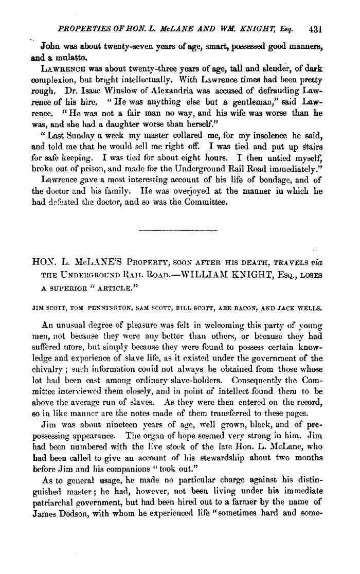 | PROPERTIES OF RON. L. McLANE AND WM. KNIGHT, Esq. 431 John was about twenty-seven years of age, smart, possessed good manners, and a mulatto. LAWRENCE was about twenty-three years of age, tall and slender, of dark complexion, but bright intellectually. With Lawrence times had been pretty rough. Dr. Isaac Winslow of Alexandria was accused of defrauding Lawrence of his hire. " He was anything else but a gentleman," said Lawrence. " He was not a fair man no way, and his wife was worse than he was, and she had a daughter worse than herself." " Last Sunday a week my master collared me, for my insolence he said, and told me that he would sell me right off. I was tied and put up Stairs for safe keeping. I was tied for about eight hours. I then untied myself, broke out of prison, and made for the Underground Rail Road immediately." Lawrence gave a most interesting account of his life of bondage, and of the doctor and his family. He was overjoyed at the manner in which he had defyated the doctor, and so was the Committee. HOX. L. McLANE'S PROPERTY, soo.v AFTER HIS DEATH, TRAVELS via THE UNDERGROUND HAIL ROAD.—WILLIAM KNIGHT, ESQ., LOSES A SUPERIOR " ARTICLE." JIM 8COTT, TOM PEXNISOTON, SAM SCOTT, BILL SCOTT, ABE BACON, AND JACK WELLS. An unusual degree of pleasure was felt in welcoming this party of young men, not because they were any better than others, or because they had suffered more, but simply because they were found to possess certain knowledge and experience of slave life, as it existed under the government of the chivalry ; siu:h information could not always l>e obtained from those whose lot had bwn cast among ordinary slave-holders. Consequently the Committee interviewed them closely, anil in poiut of intellect found them to be above the average run of slaves. As they were then entered on the record, so ia like manner are the notes made of them transferred to these pages. Jim was about nineteen years of age, well grown, black, and of prepossessing appearance. The organ of hope seemed very strong in him. Jim had been numbered with the live stoi-k of the late Hon. L. McLane, who had been called to give an account of his stewardship about two months before Jim and his companions " took out." As to general usage, he made no particular charge against his distinguished master; he had, however, not been living under his immediate patriarchal government, but had been hired out to a farmer by the name of James Dodson, with whom he experienced life "sometimes hard and some- |